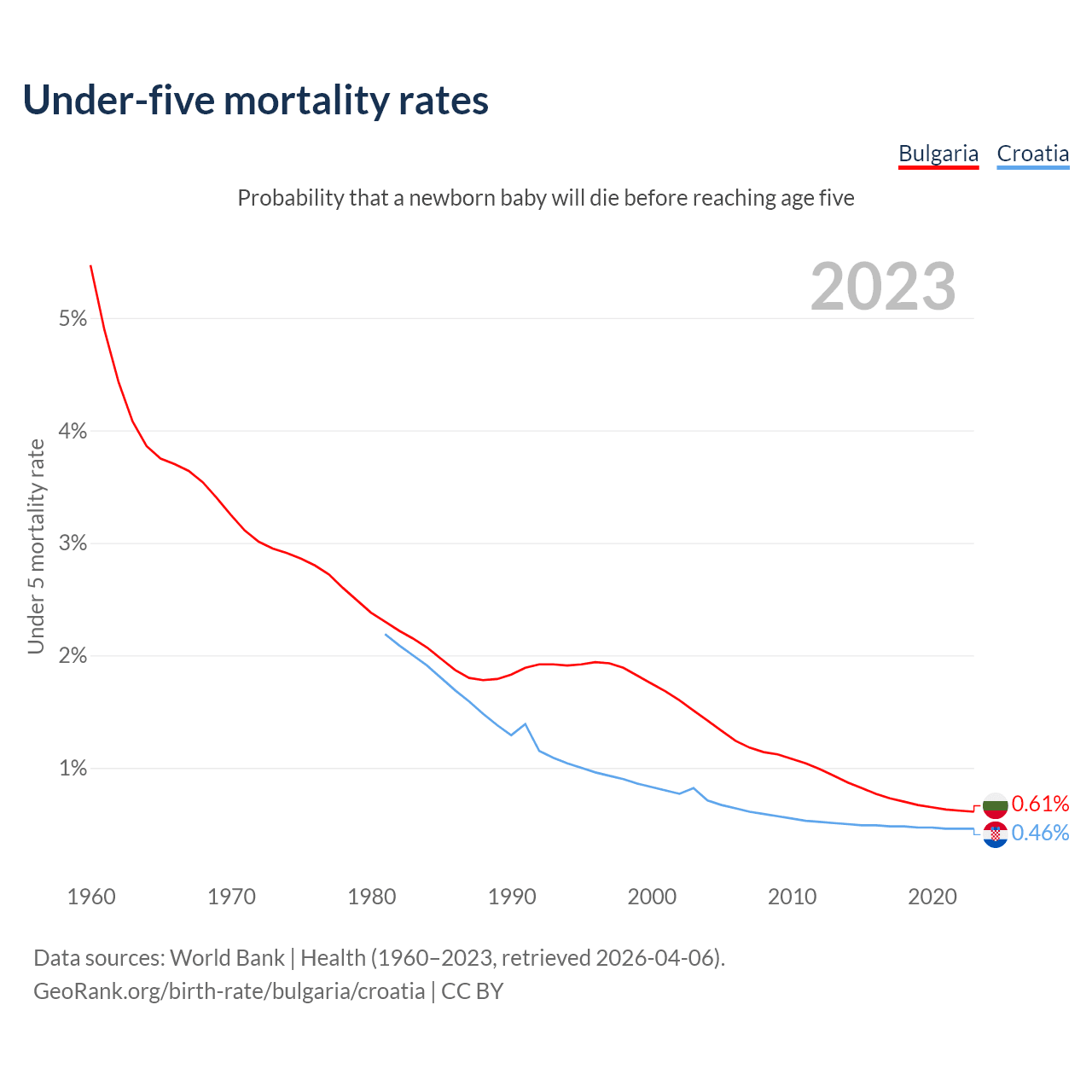 The chance that a newborn baby will die before reaching age five is 0.61% in Bulgaria and 0.46% in Croatia. Above is a chart with historical data on under-five mortality rates.