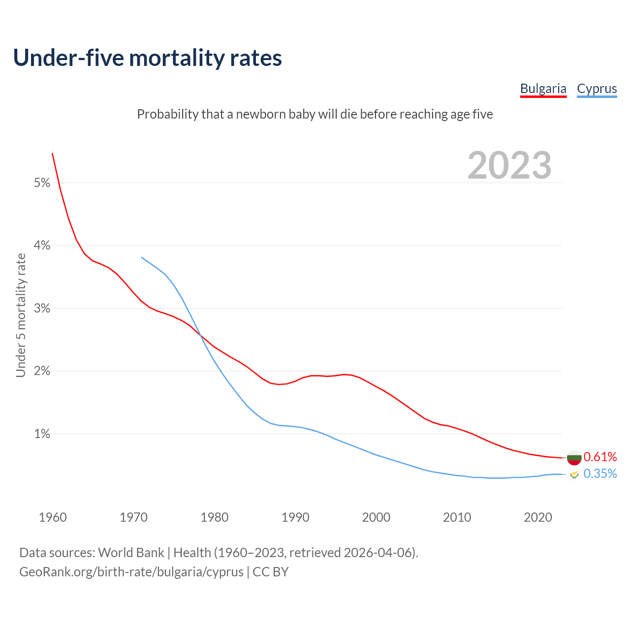 The chance that a newborn baby will die before reaching age five is 0.61% in Bulgaria and 0.35% in Cyprus. Above is a chart with historical data on under-five mortality rates.
