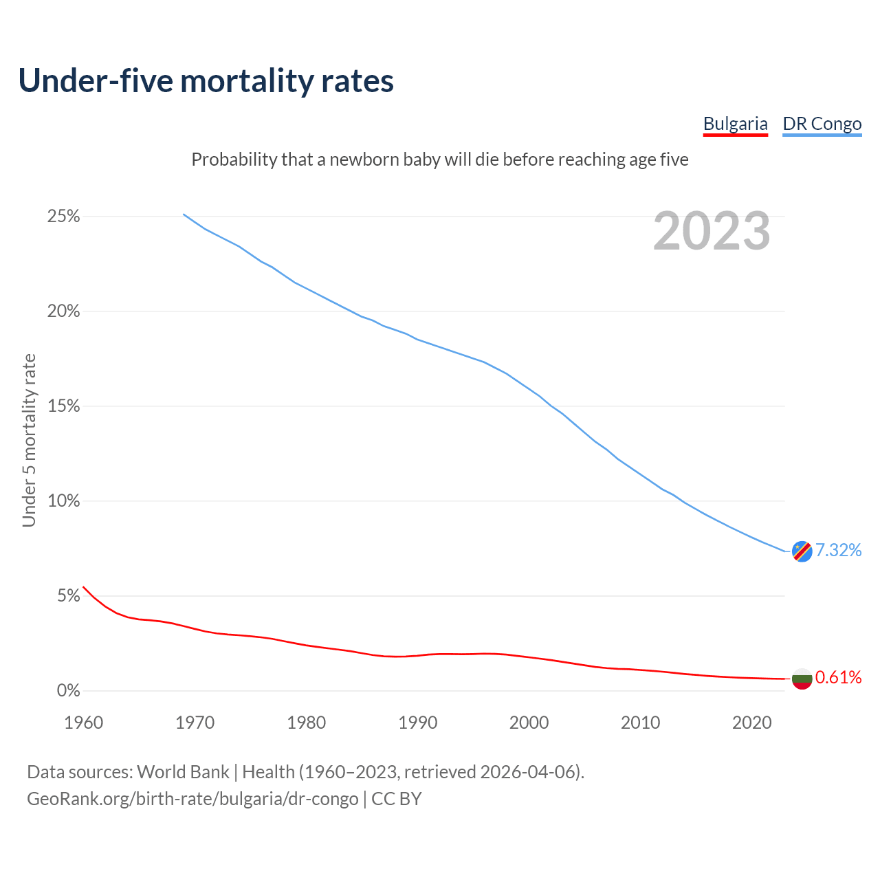 The chance that a newborn baby will die before reaching age five is 0.61% in Bulgaria and 7.32% in the DR Congo. Above is a chart with historical data on under-five mortality rates.