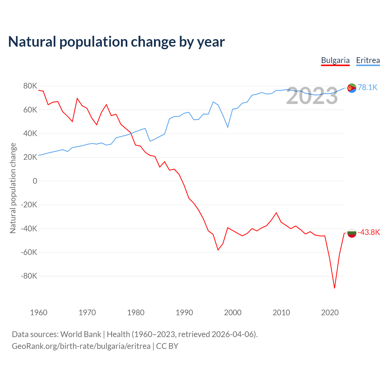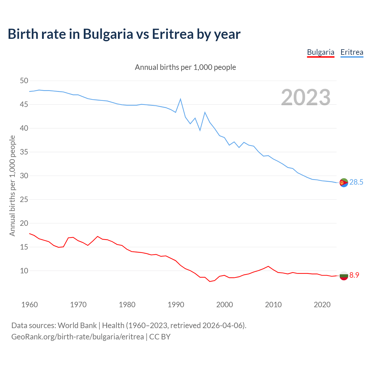 Bulgaria has an annual birth rate of 8.9 births per 1,000 people, compared to 28.5 for Eritrea. The average number of children a woman is expected to have during her lifetime — the fertility rate, is 1.81 in Bulgaria and 3.71 in Eritrea — 105.1% difference.