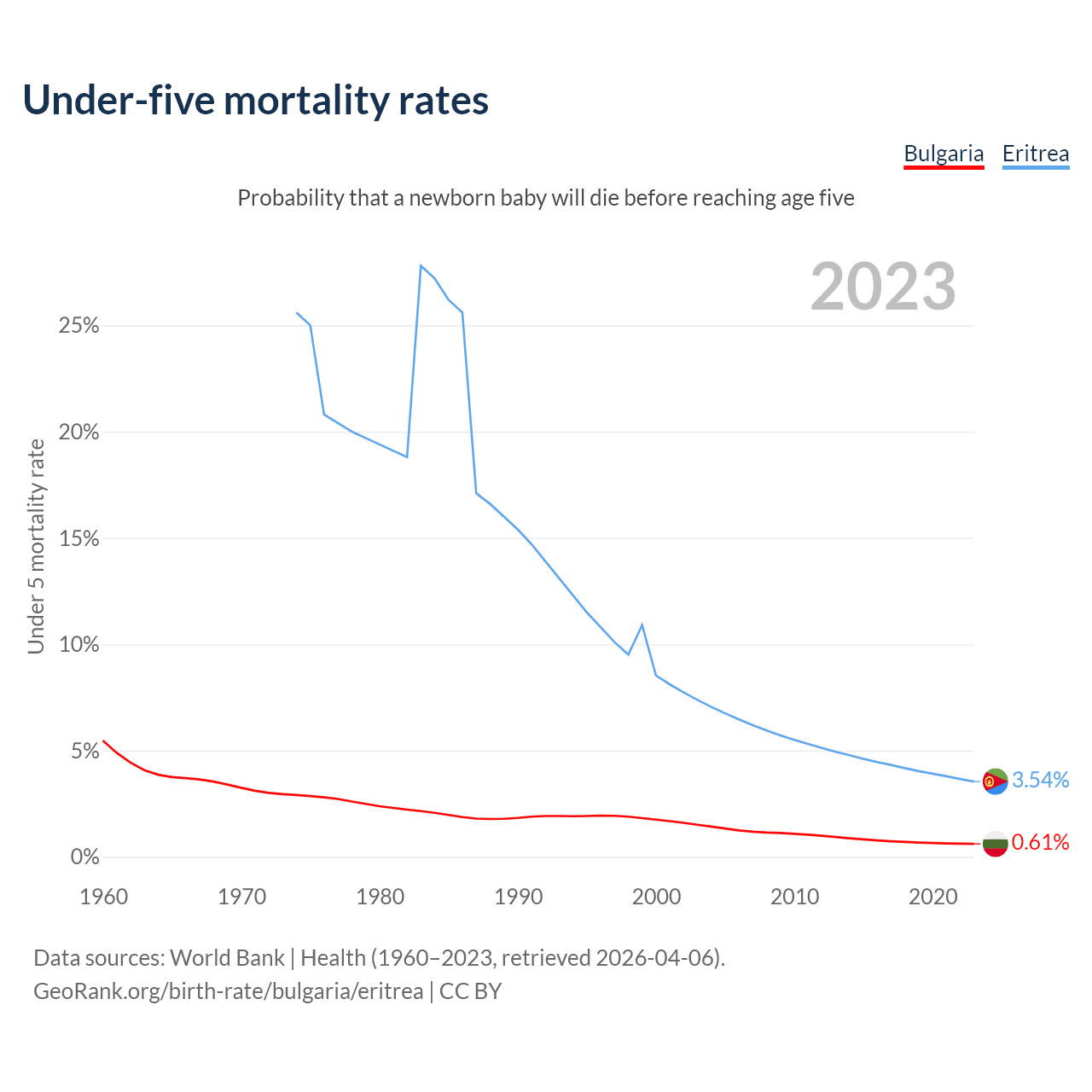 The chance that a newborn baby will die before reaching age five is 0.61% in Bulgaria and 3.54% in Eritrea. Above is a chart with historical data on under-five mortality rates.