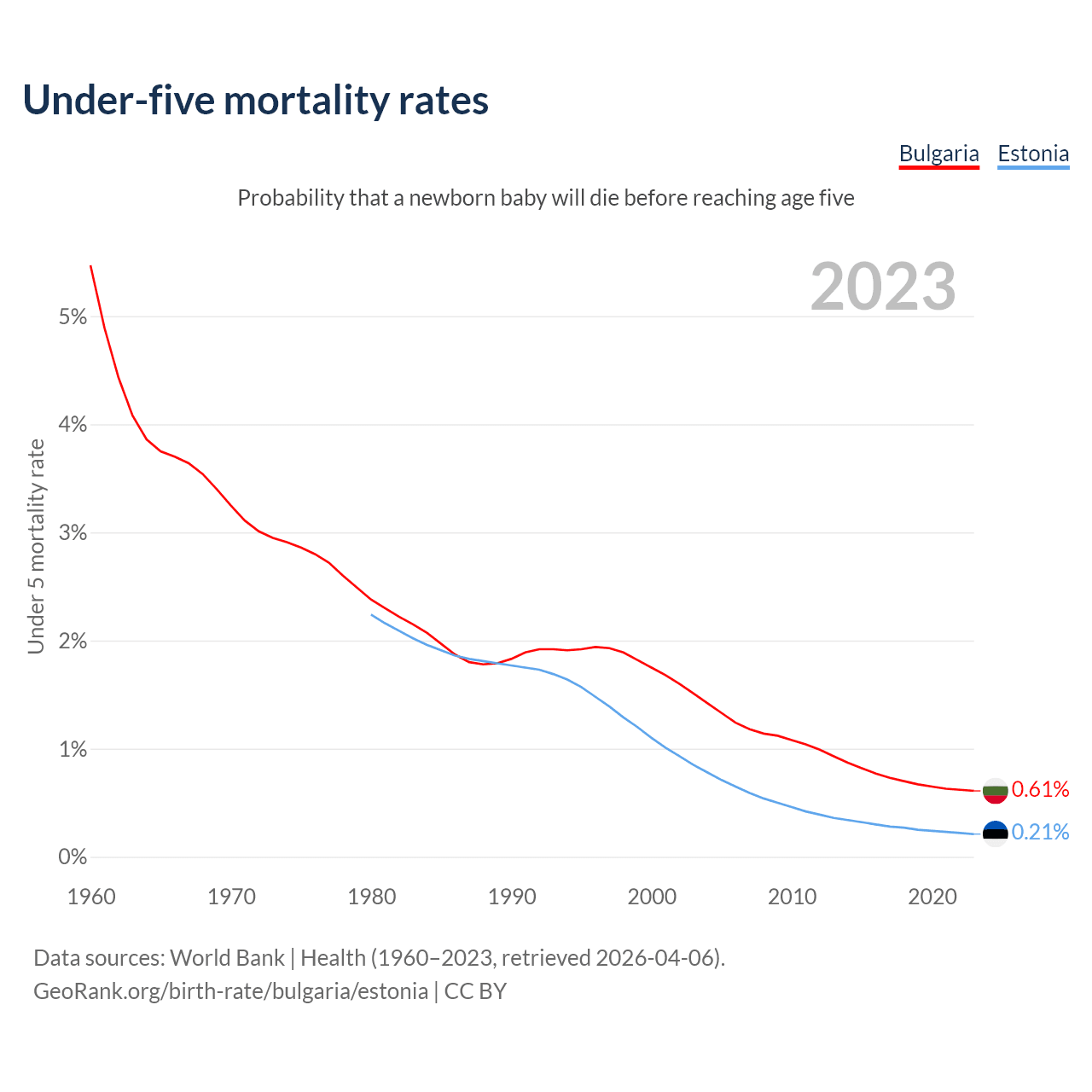 The chance that a newborn baby will die before reaching age five is 0.61% in Bulgaria and 0.21% in Estonia. Above is a chart with historical data on under-five mortality rates.