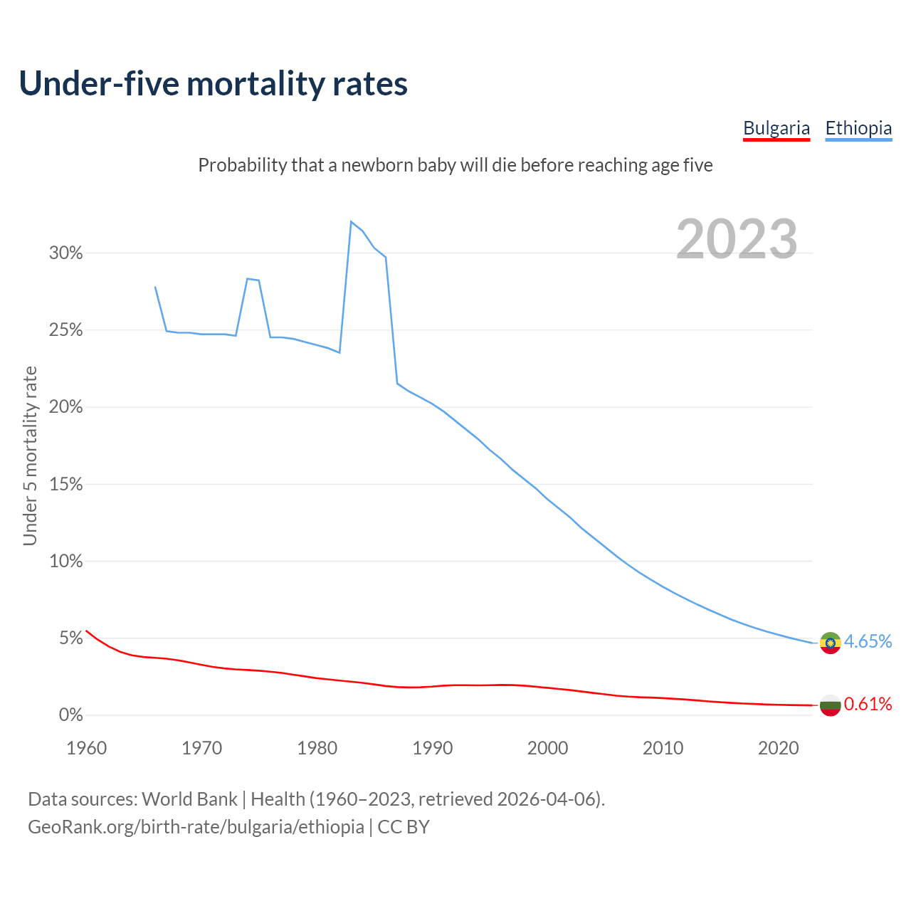 The chance that a newborn baby will die before reaching age five is 0.61% in Bulgaria and 4.65% in Ethiopia. Above is a chart with historical data on under-five mortality rates.