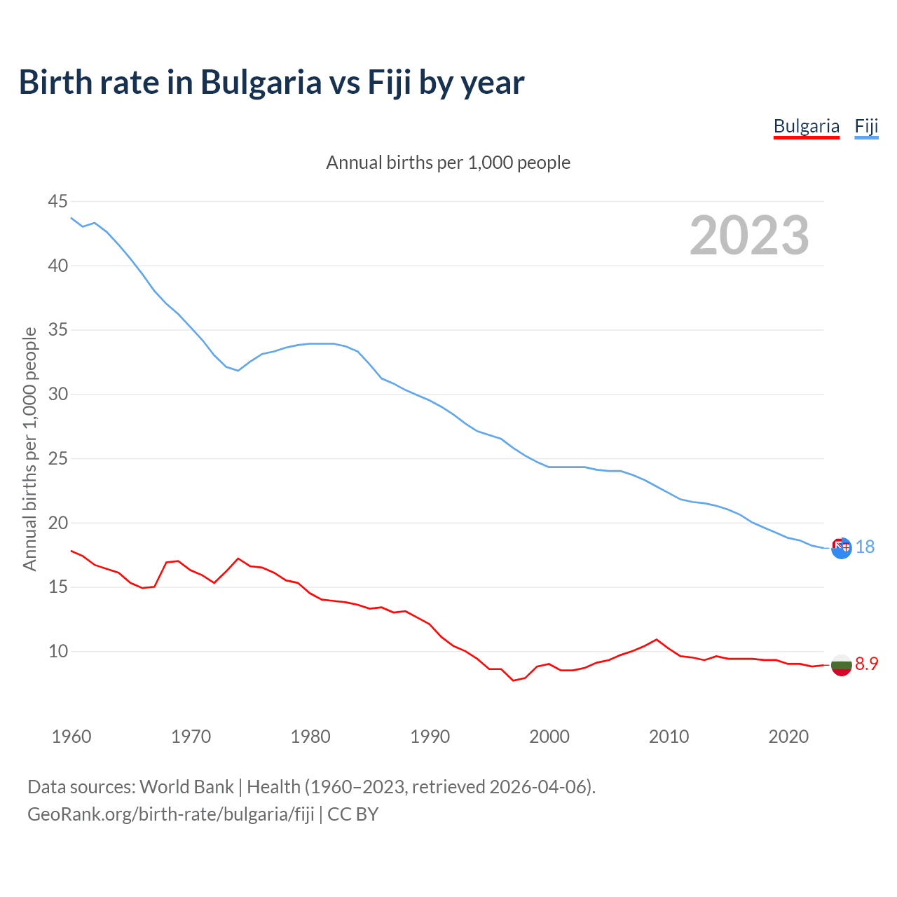 Bulgaria has an annual birth rate of 8.9 births per 1,000 people, compared to 18 for Fiji. The average number of children a woman is expected to have during her lifetime — the fertility rate, is 1.81 in Bulgaria and 2.28 in Fiji — 26% difference.