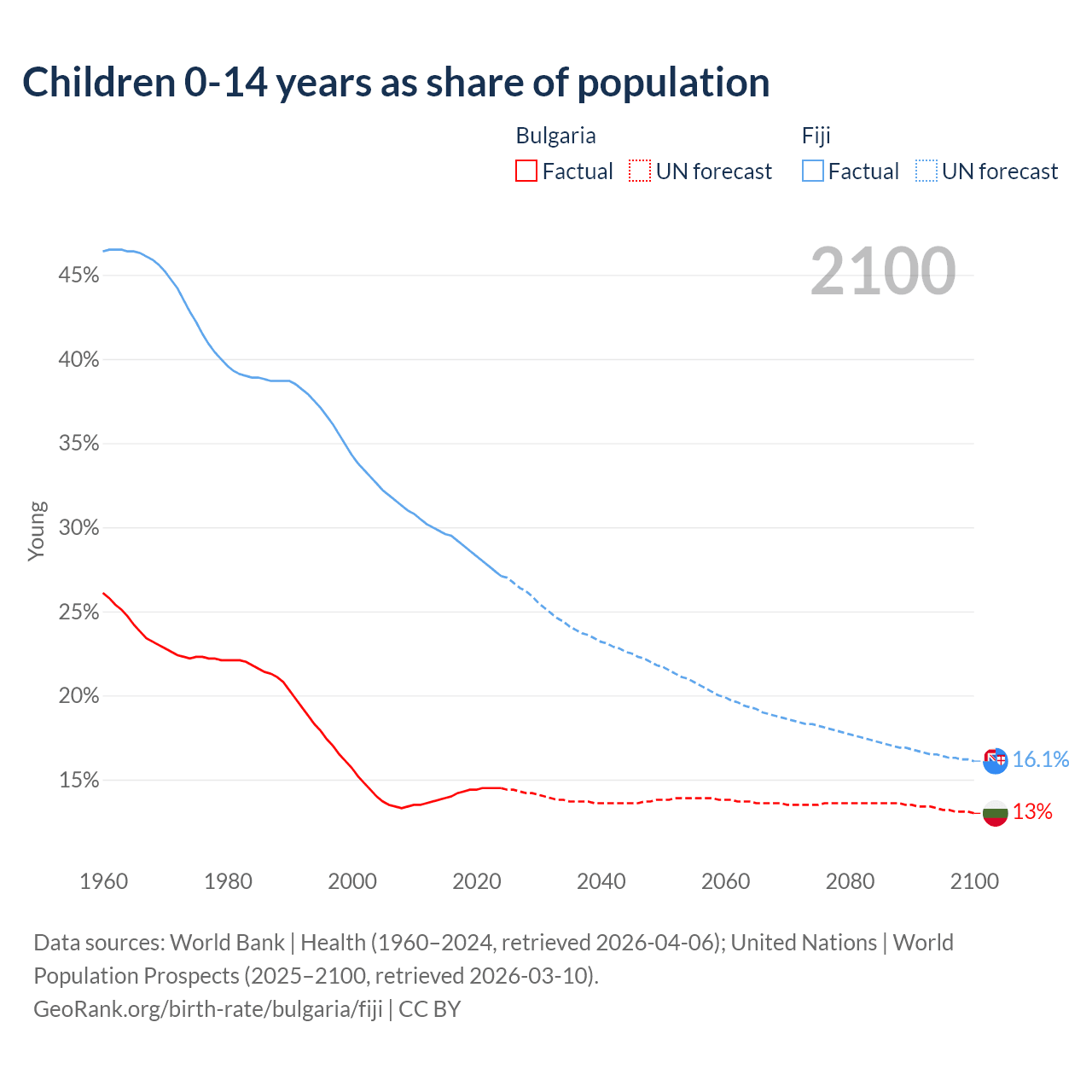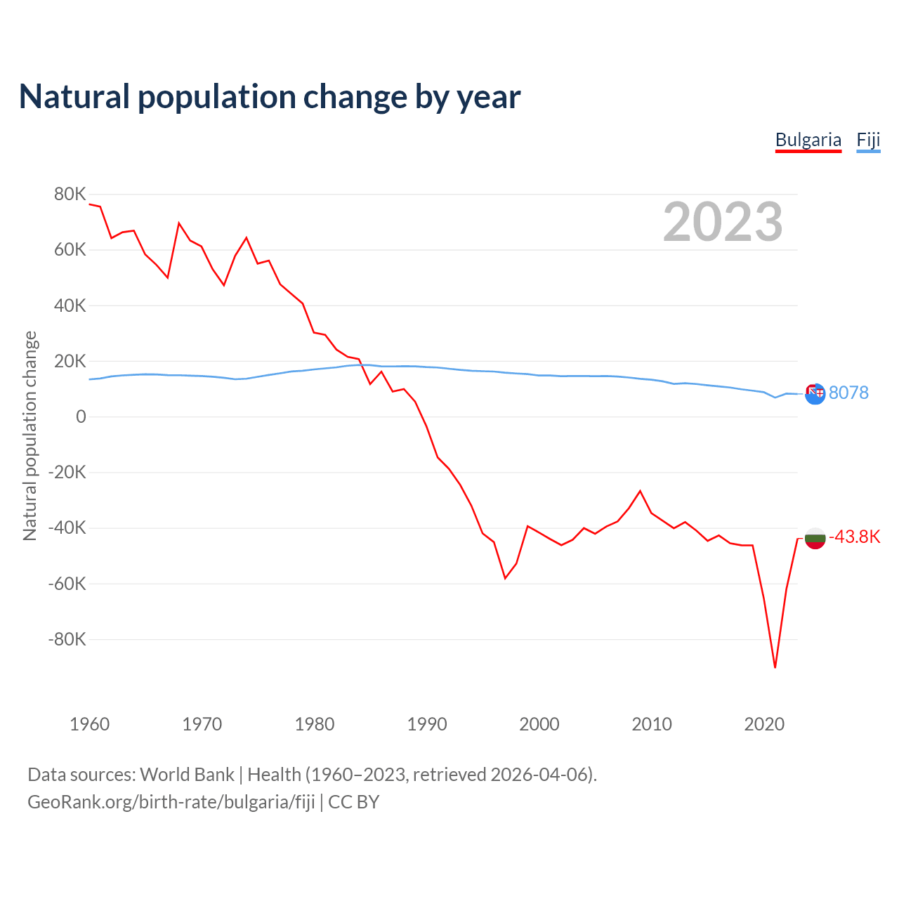 According to the latest available data on birth rates, the fertility rate in Bulgaria was 1.81 children per woman in 2023, compared to 2.28 in Fiji in 2023. The replacement level is considered to be 2.1 children per woman.