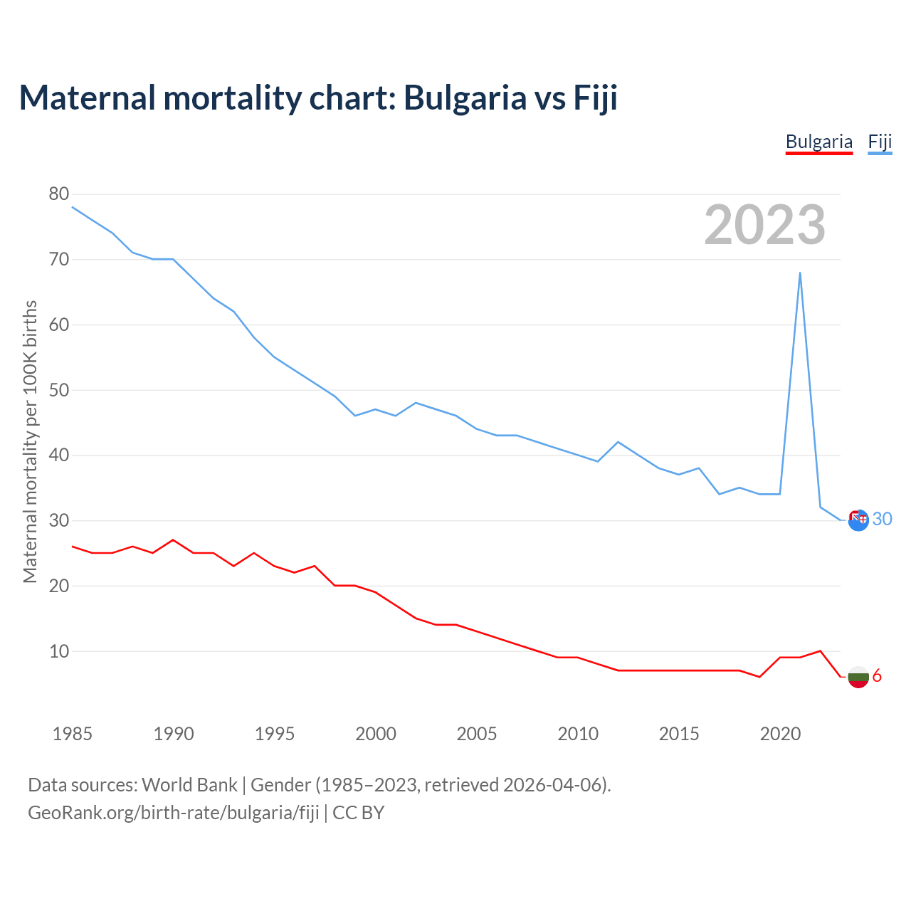 The maternal mortality rate, which is the probability of dying during childbirth or within 42 days of pregnancy termination, is 6 deaths per 100,000 live births in Bulgaria, compared to 30 deaths in Fiji.