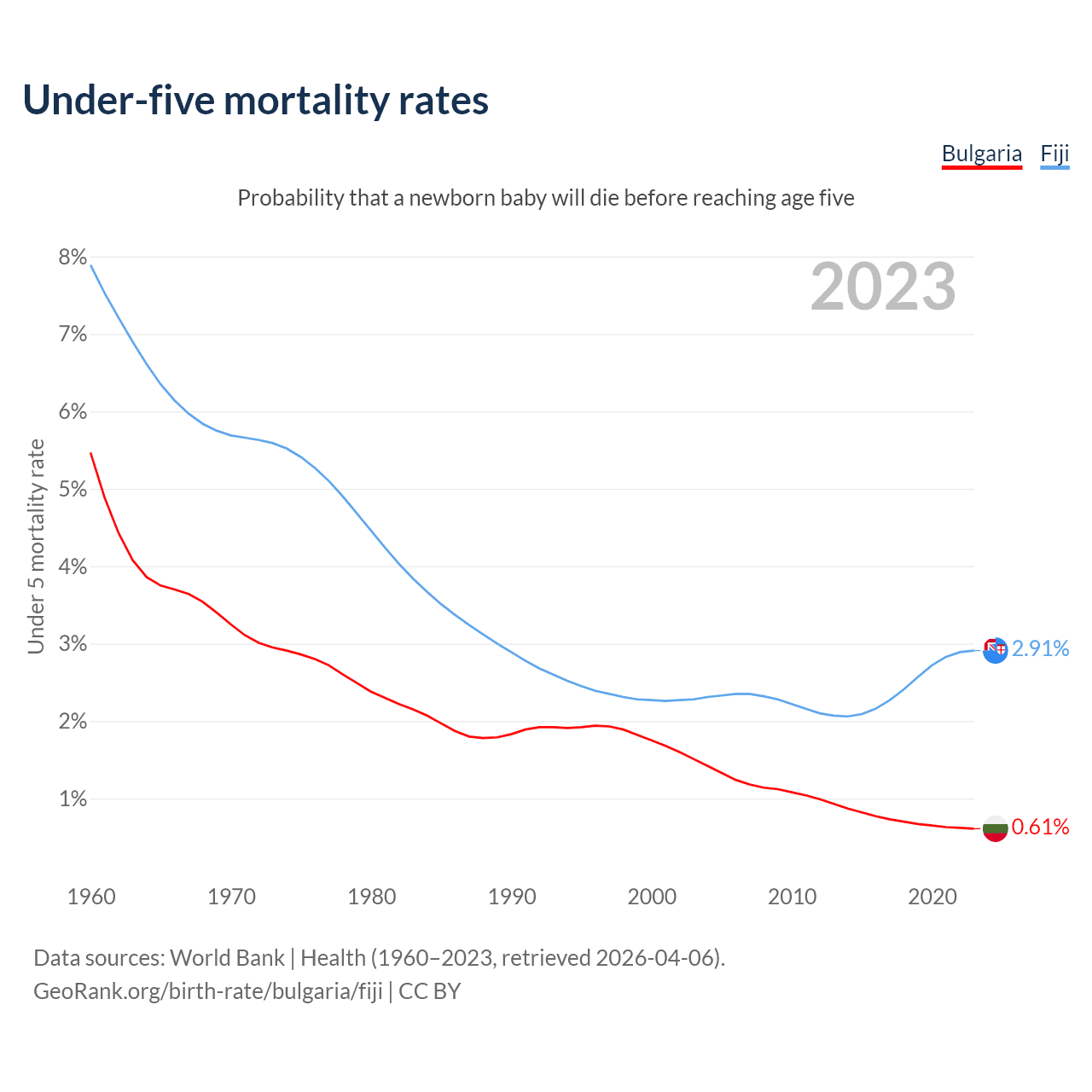 The chance that a newborn baby will die before reaching age five is 0.61% in Bulgaria and 2.91% in Fiji. Above is a chart with historical data on under-five mortality rates.