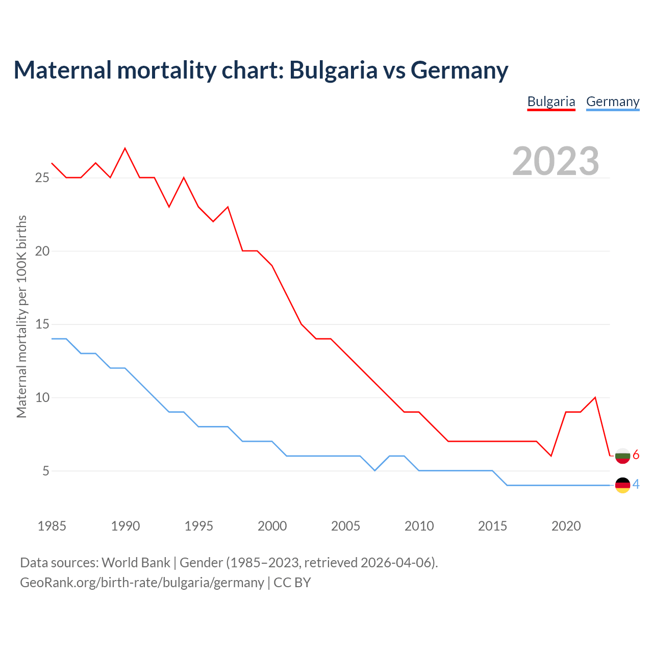 The maternal mortality rate, which is the probability of dying during childbirth or within 42 days of pregnancy termination, is 6 deaths per 100,000 live births in Bulgaria, compared to 4 deaths in Germany.