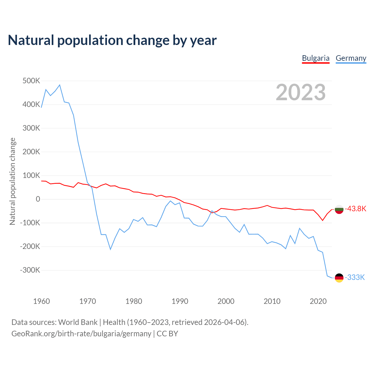 According to the latest available data on birth rates, the fertility rate in Bulgaria was 1.81 children per woman in 2023, compared to 1.39 in Germany in 2023. The replacement level is considered to be 2.1 children per woman.