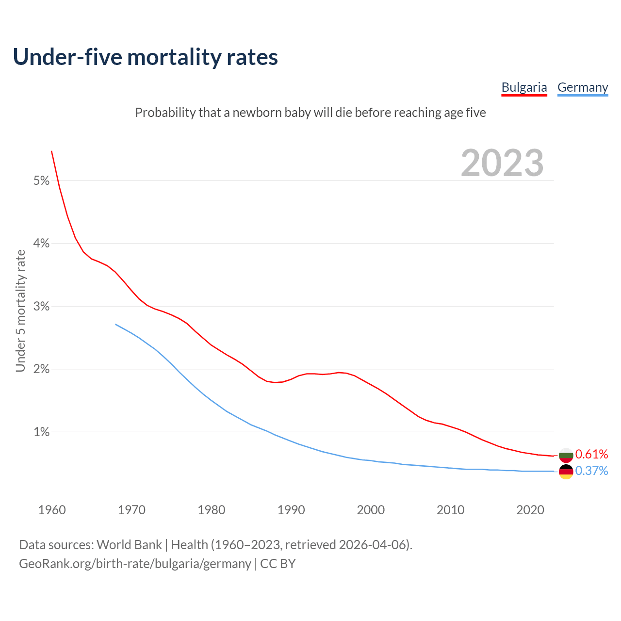 The chance that a newborn baby will die before reaching age five is 0.61% in Bulgaria and 0.37% in Germany. Above is a chart with historical data on under-five mortality rates.