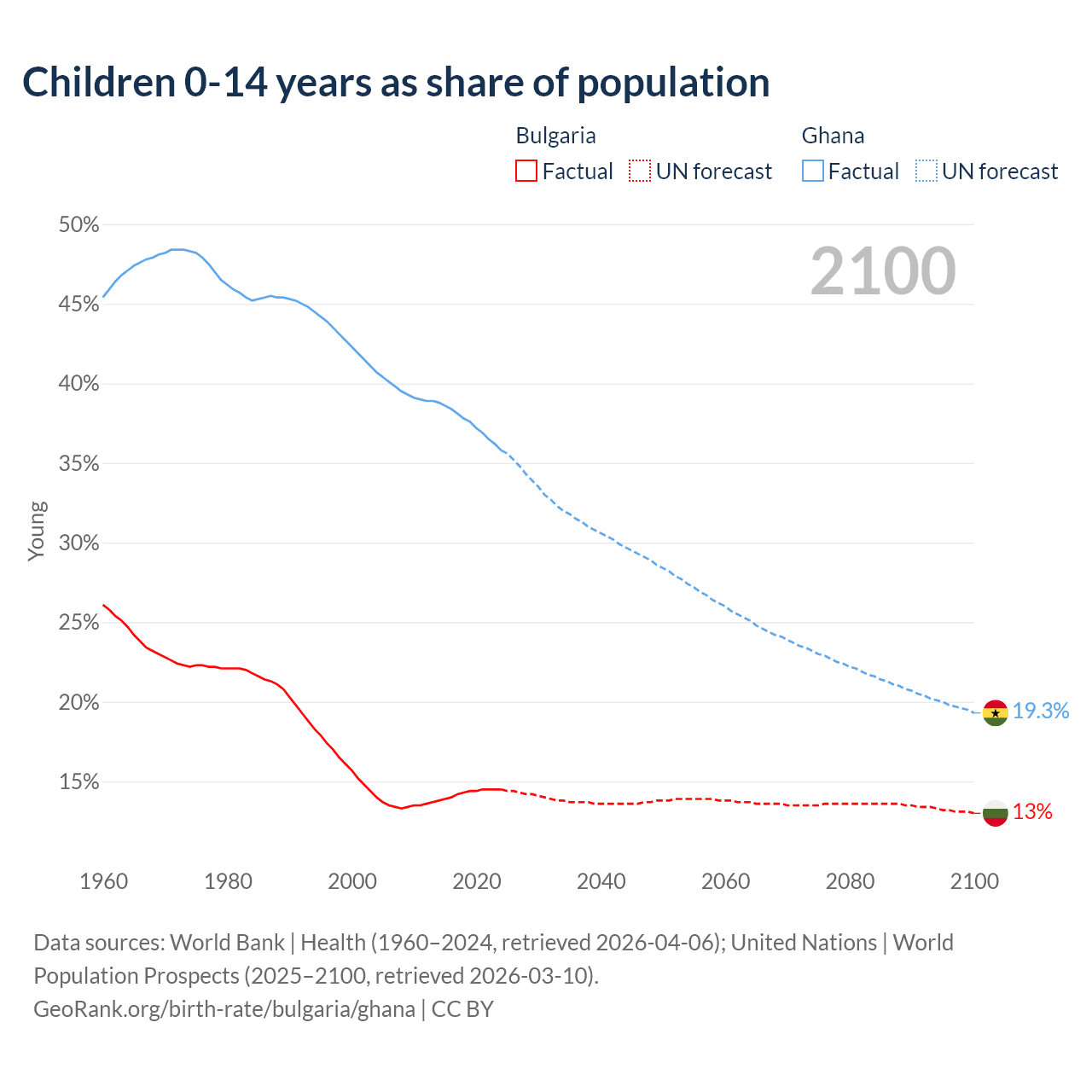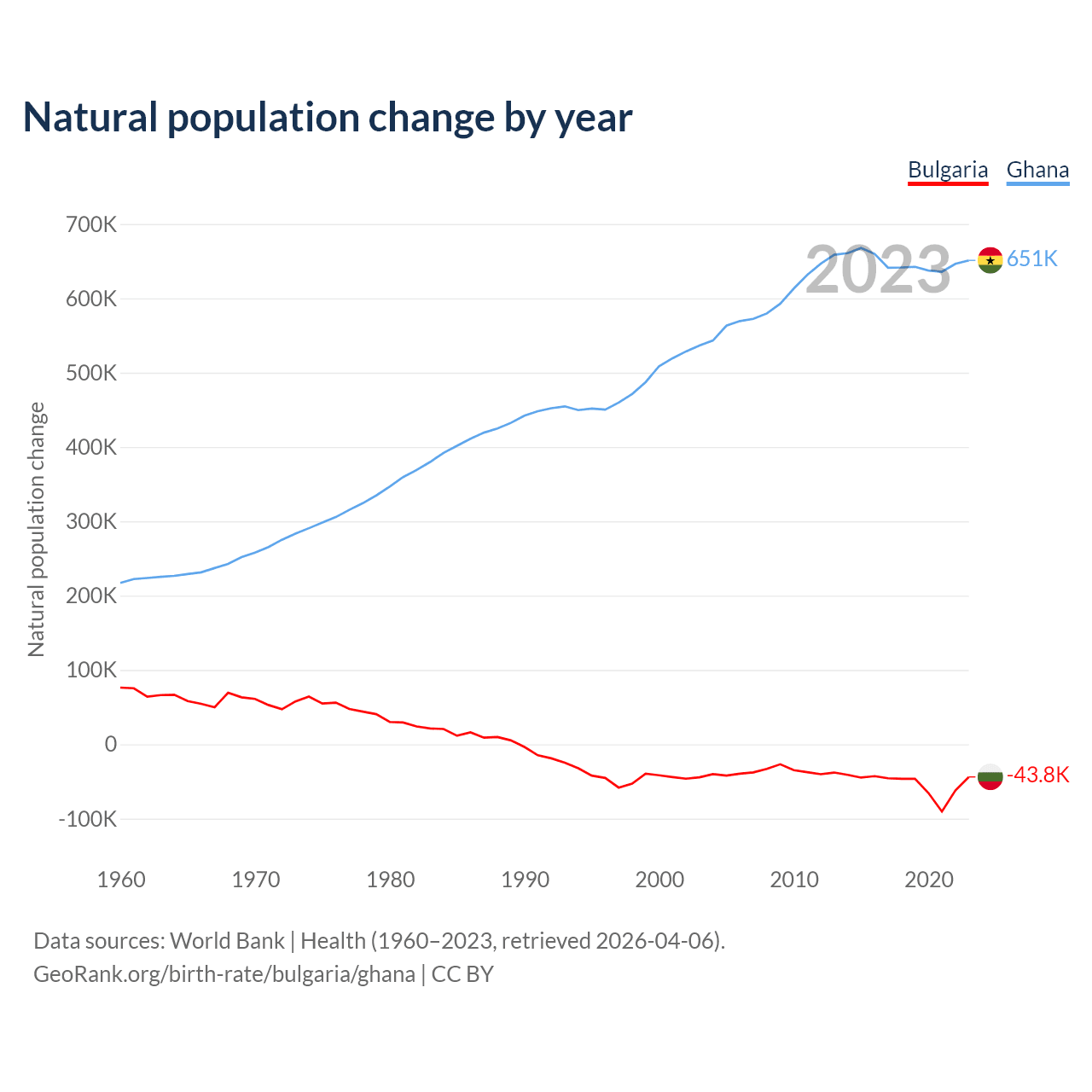 Bulgaria has an annual birth rate of 8.9 births per 1,000 people, compared to 26.3 for Ghana. The average number of children a woman is expected to have during her lifetime — the fertility rate, is 1.81 in Bulgaria and 3.4 in Ghana — 87.7% difference.