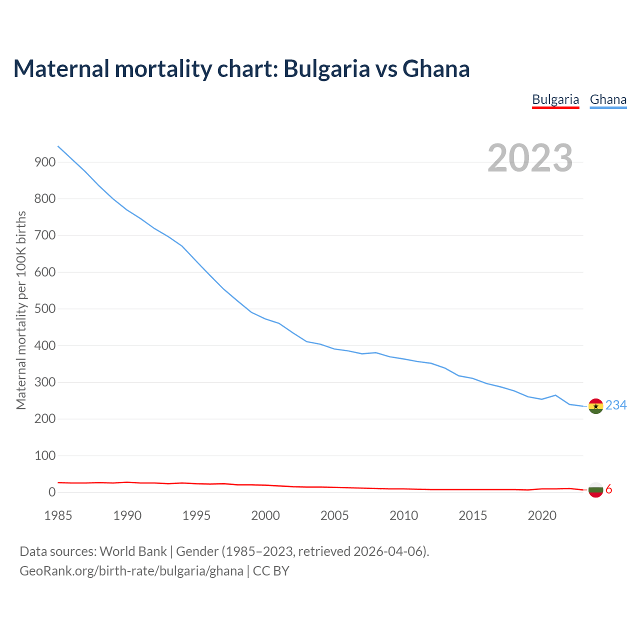 The maternal mortality rate, which is the probability of dying during childbirth or within 42 days of pregnancy termination, is 6 deaths per 100,000 live births in Bulgaria, compared to 234 deaths in Ghana.