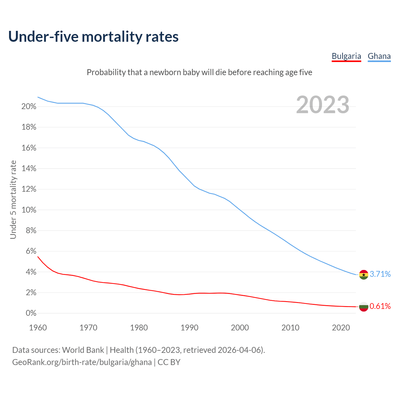 The chance that a newborn baby will die before reaching age five is 0.61% in Bulgaria and 3.71% in Ghana. Above is a chart with historical data on under-five mortality rates.