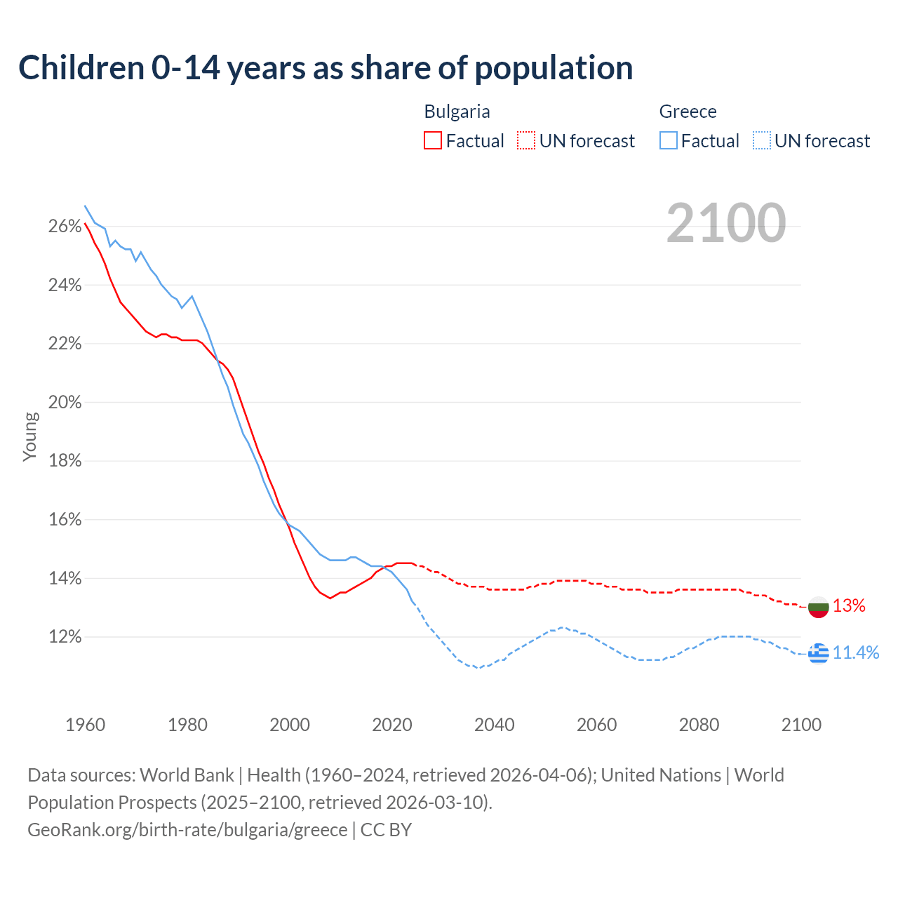 According to the latest available data on birth rates, the fertility rate in Bulgaria was 1.81 children per woman in 2023, compared to 1.32 in Greece in 2023. The replacement level is considered to be 2.1 children per woman.