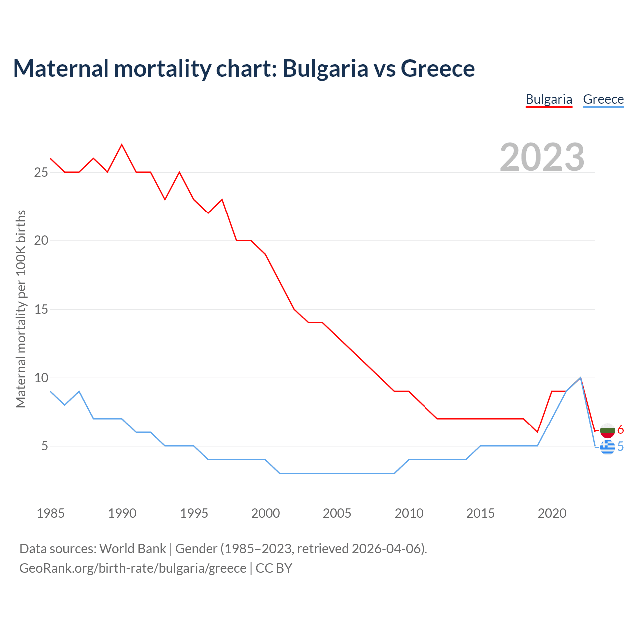 The maternal mortality rate, which is the probability of dying during childbirth or within 42 days of pregnancy termination, is 6 deaths per 100,000 live births in Bulgaria, compared to 5 deaths in Greece.