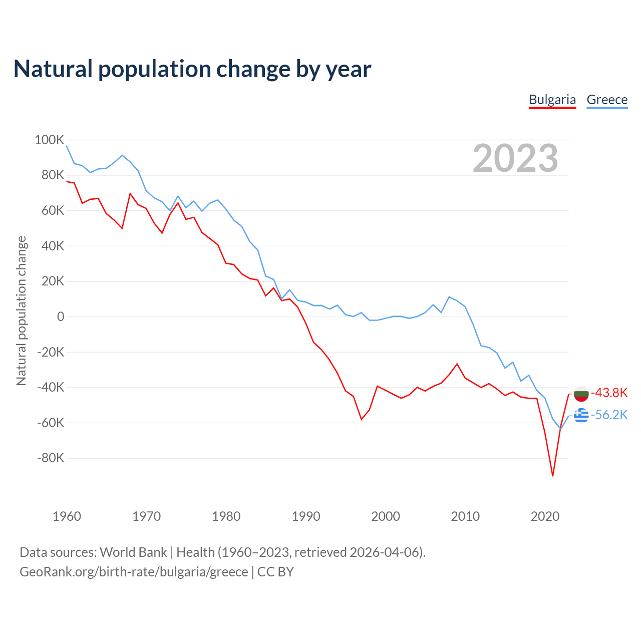 1960 vs 2023, the fertility rate has decreased by 21.6% in Bulgaria and by 40.8% in Greece — in 1960, it was 2.31 and 2.23, respectively.