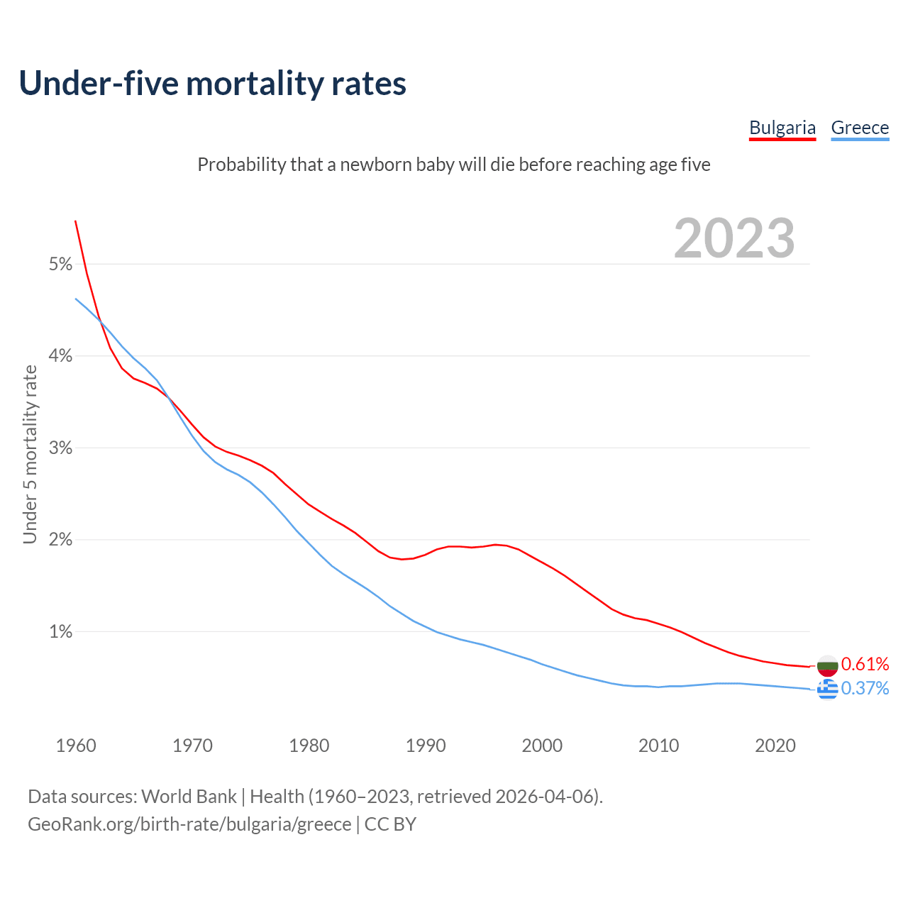 The chance that a newborn baby will die before reaching age five is 0.61% in Bulgaria and 0.37% in Greece. Above is a chart with historical data on under-five mortality rates.