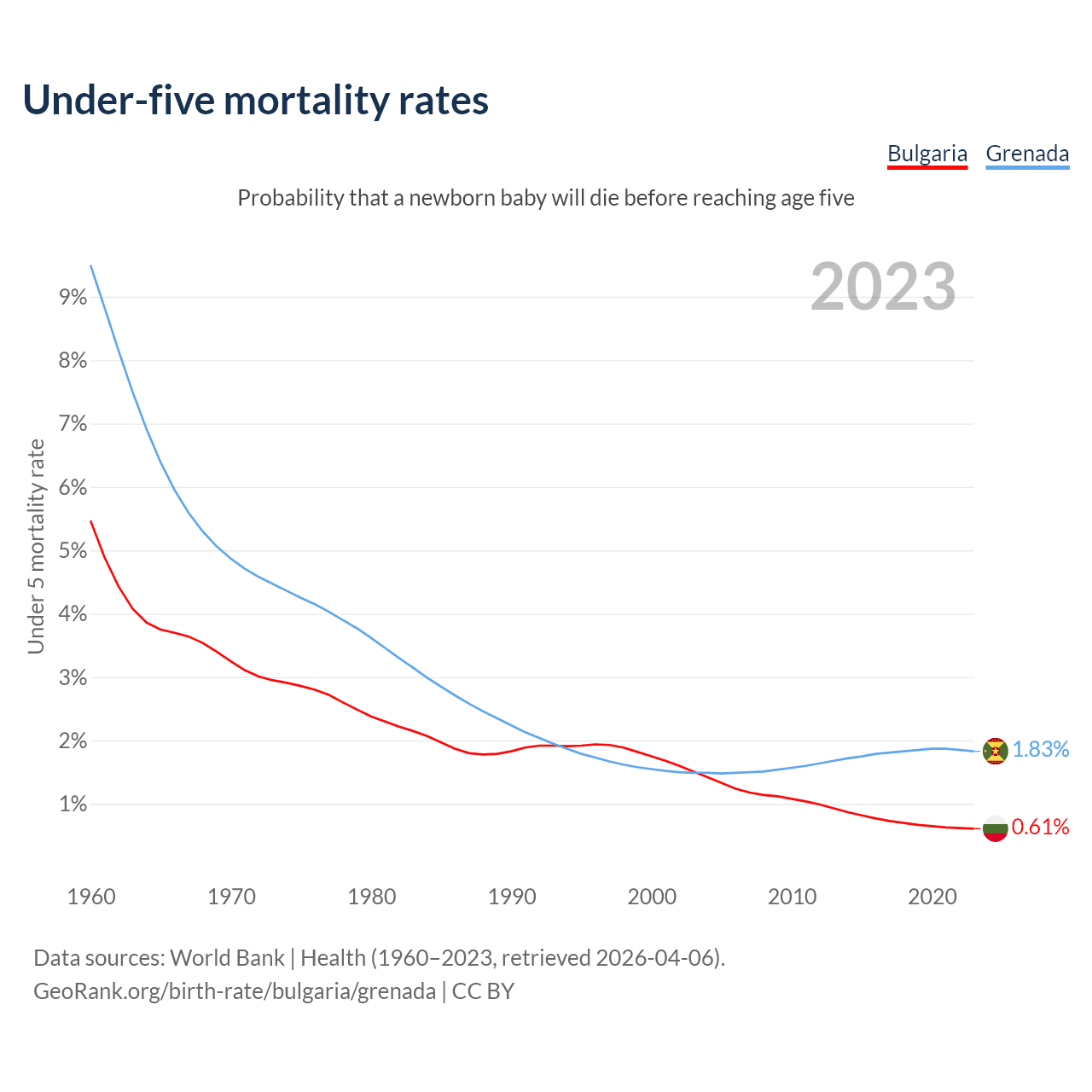 The chance that a newborn baby will die before reaching age five is 0.61% in Bulgaria and 1.83% in Grenada. Above is a chart with historical data on under-five mortality rates.