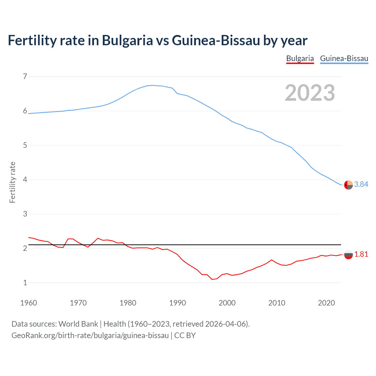 1960 vs 2023, the fertility rate has decreased by 21.6% in Bulgaria and by 35.2% in Guinea-Bissau — in 1960, it was 2.31 and 5.92, respectively.