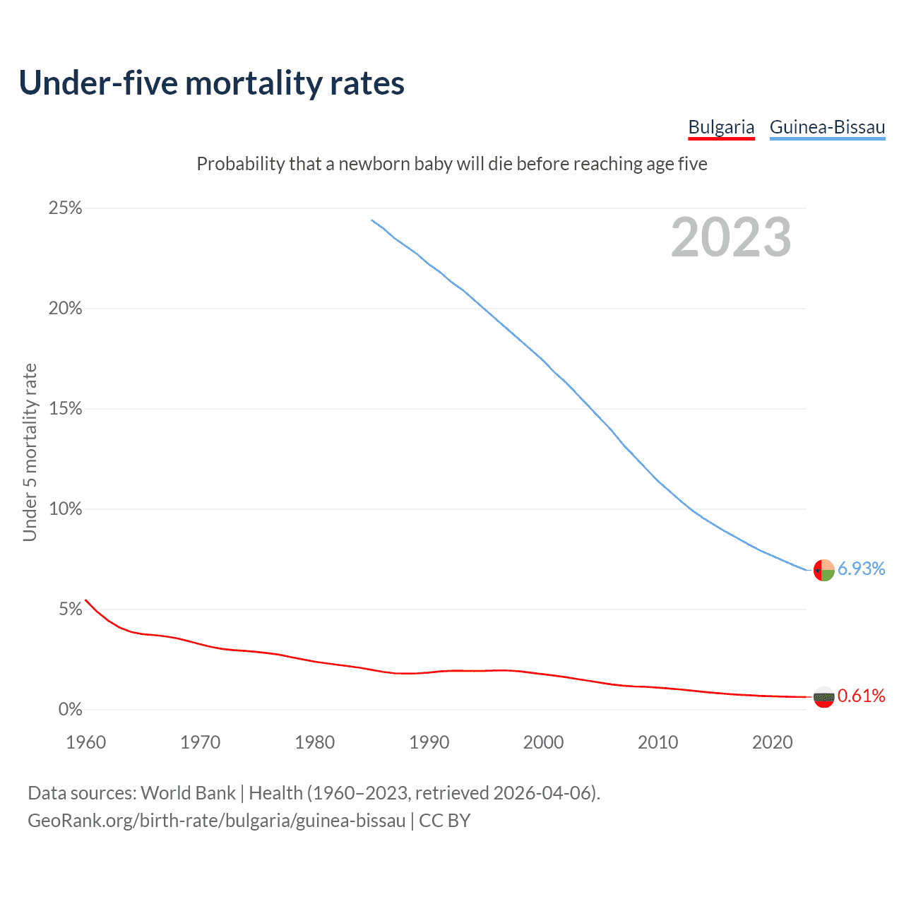 The chance that a newborn baby will die before reaching age five is 0.61% in Bulgaria and 6.93% in Guinea-Bissau. Above is a chart with historical data on under-five mortality rates.