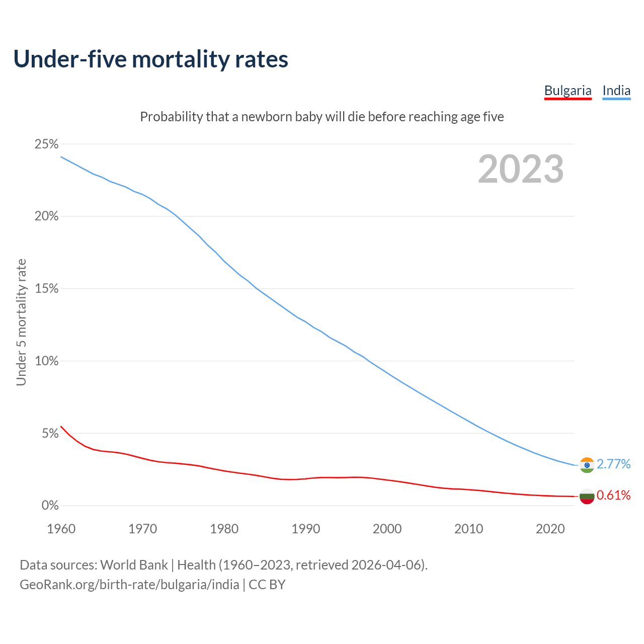 The chance that a newborn baby will die before reaching age five is 0.61% in Bulgaria and 2.77% in India. Above is a chart with historical data on under-five mortality rates.