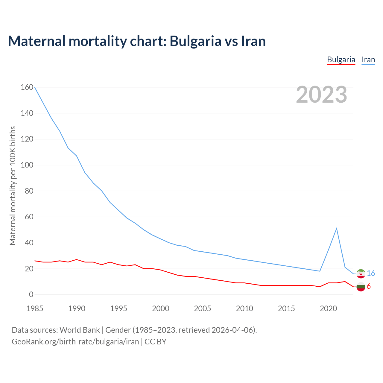 The maternal mortality rate, which is the probability of dying during childbirth or within 42 days of pregnancy termination, is 6 deaths per 100,000 live births in Bulgaria, compared to 16 deaths in Iran.