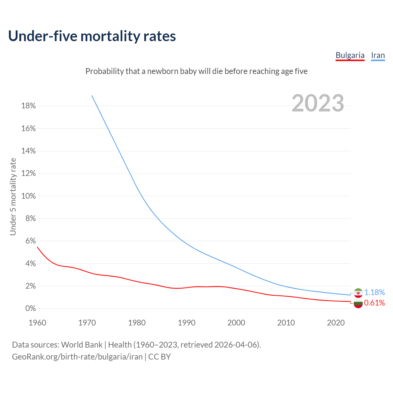 The chance that a newborn baby will die before reaching age five is 0.61% in Bulgaria and 1.18% in Iran. Above is a chart with historical data on under-five mortality rates.