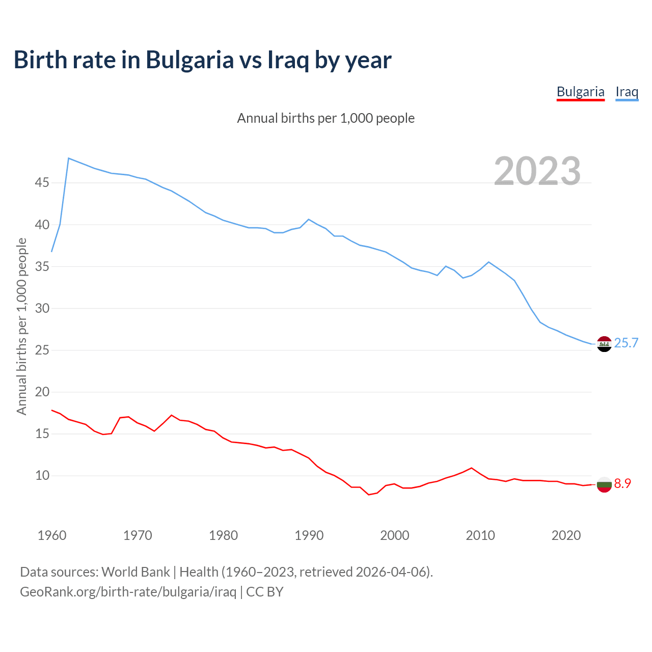 Bulgaria has an annual birth rate of 8.9 births per 1,000 people, compared to 25.7 for Iraq. The average number of children a woman is expected to have during her lifetime — the fertility rate, is 1.81 in Bulgaria and 3.25 in Iraq — 79.5% difference.