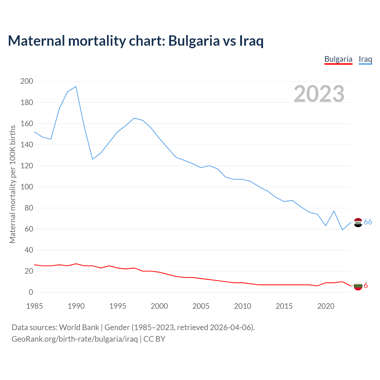 The maternal mortality rate, which is the probability of dying during childbirth or within 42 days of pregnancy termination, is 6 deaths per 100,000 live births in Bulgaria, compared to 66 deaths in Iraq.