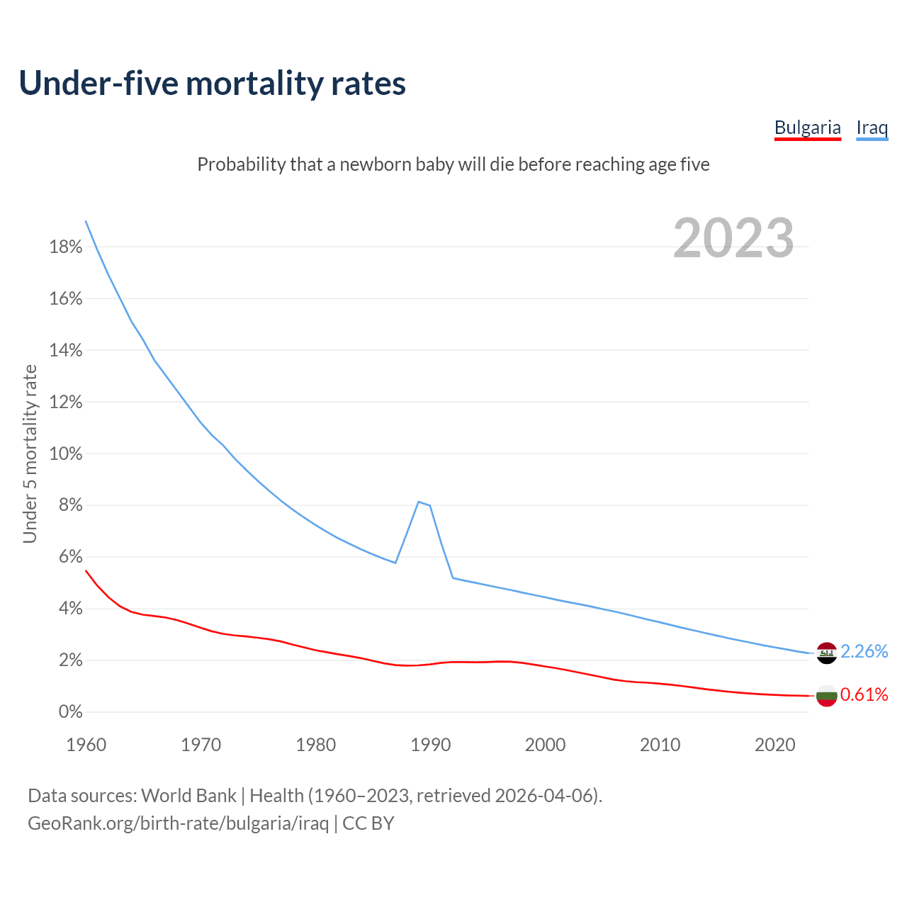 The chance that a newborn baby will die before reaching age five is 0.61% in Bulgaria and 2.26% in Iraq. Above is a chart with historical data on under-five mortality rates.