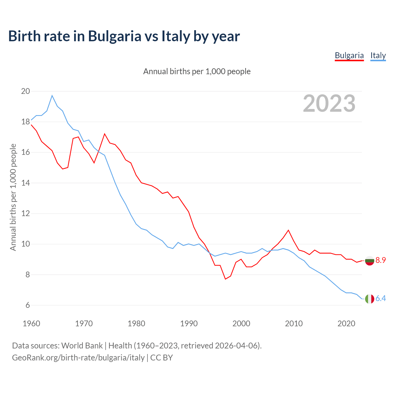 Bulgaria has an annual birth rate of 8.9 births per 1,000 people, compared to 6.4 for Italy. The average number of children a woman is expected to have during her lifetime — the fertility rate, is 1.81 in Bulgaria and 1.2 in Italy — 33.7% difference.