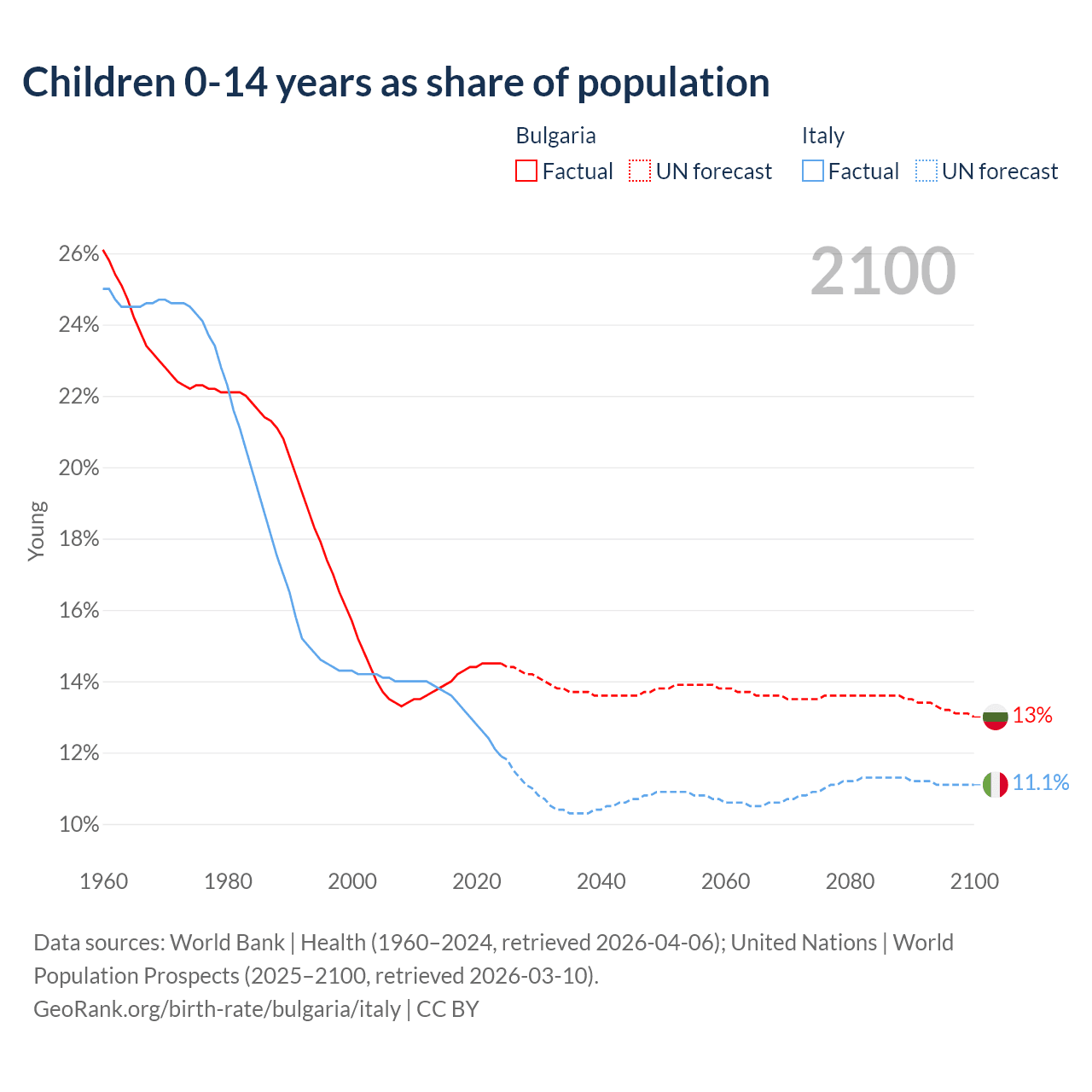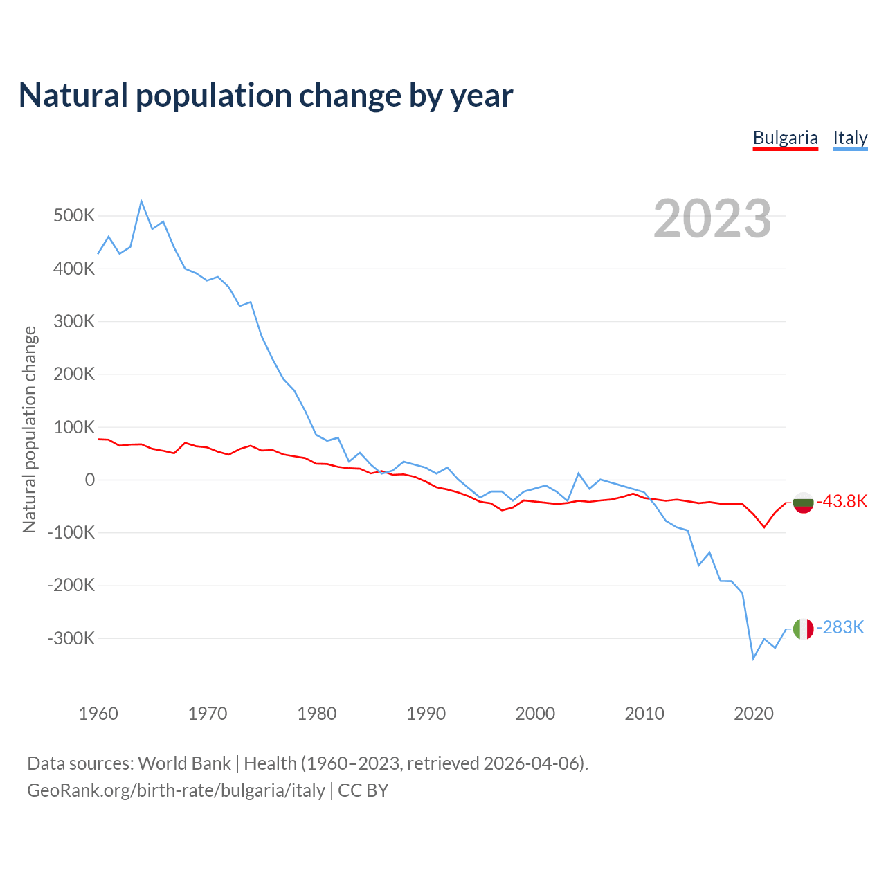 According to the latest available data on birth rates, the fertility rate in Bulgaria was 1.81 children per woman in 2023, compared to 1.2 in Italy in 2023. The replacement level is considered to be 2.1 children per woman.