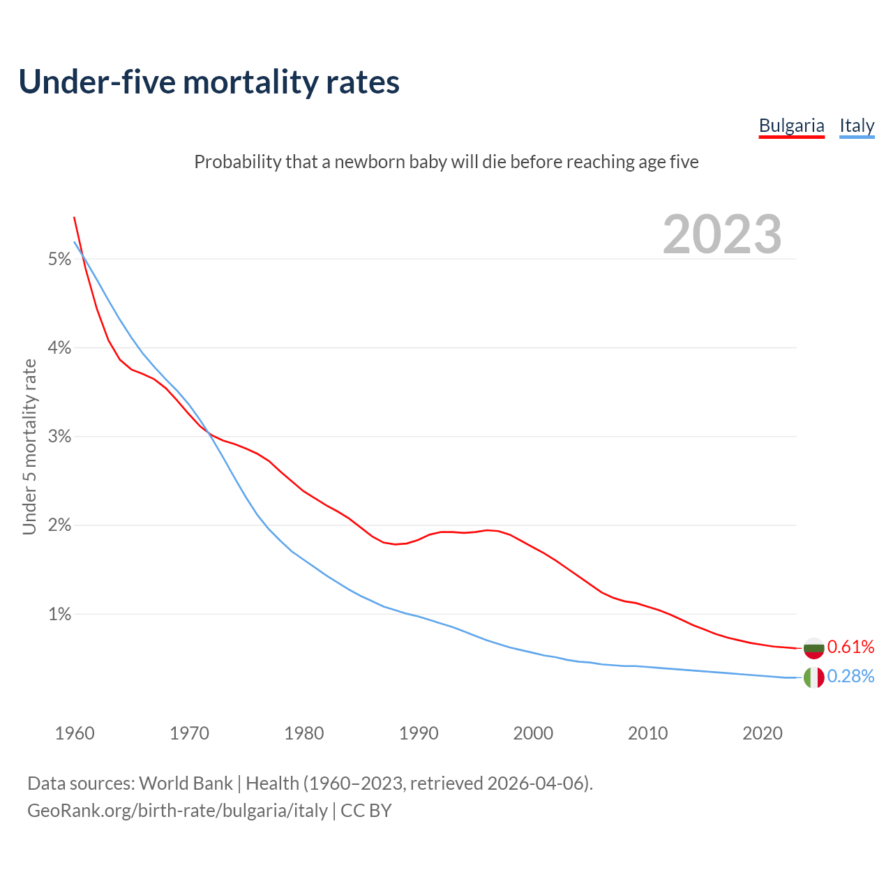 The chance that a newborn baby will die before reaching age five is 0.61% in Bulgaria and 0.28% in Italy. Above is a chart with historical data on under-five mortality rates.