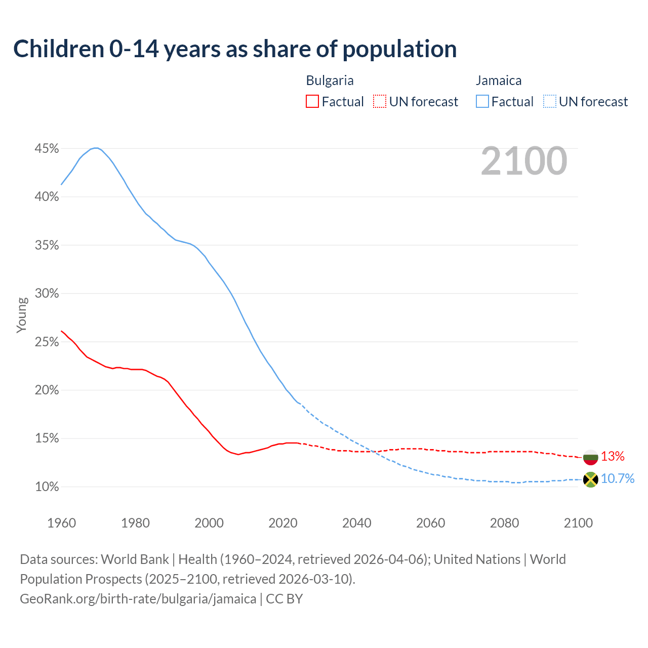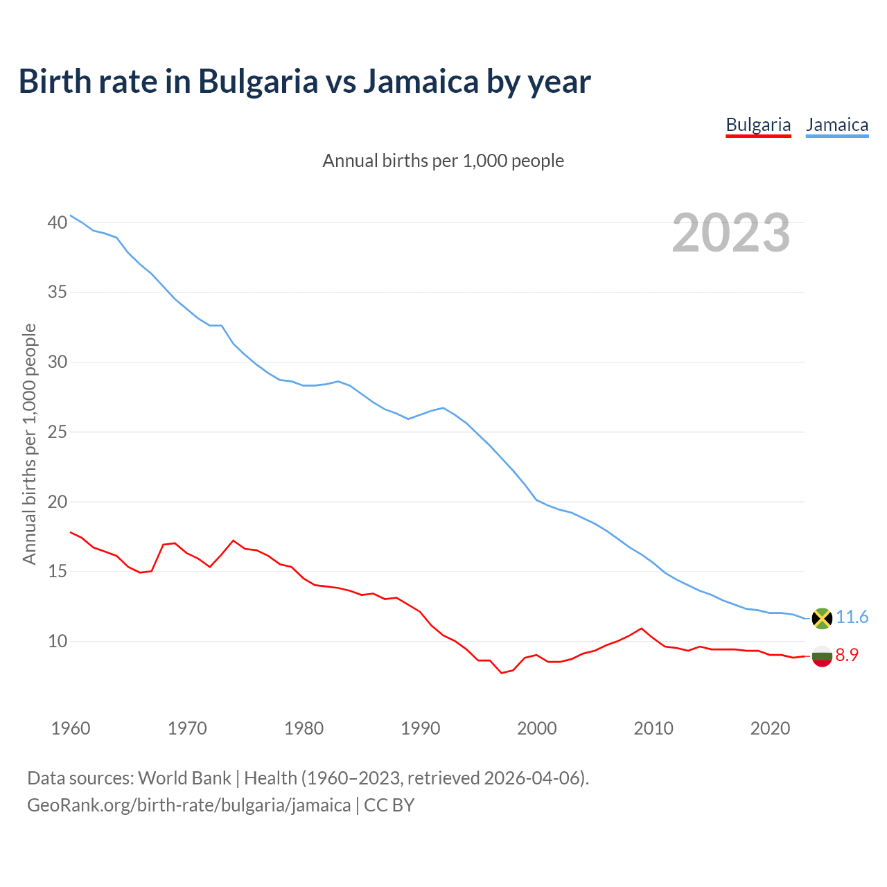 Bulgaria has an annual birth rate of 8.9 births per 1,000 people, compared to 11.6 for Jamaica. The average number of children a woman is expected to have during her lifetime — the fertility rate, is 1.81 in Bulgaria and 1.36 in Jamaica — 25% difference.
