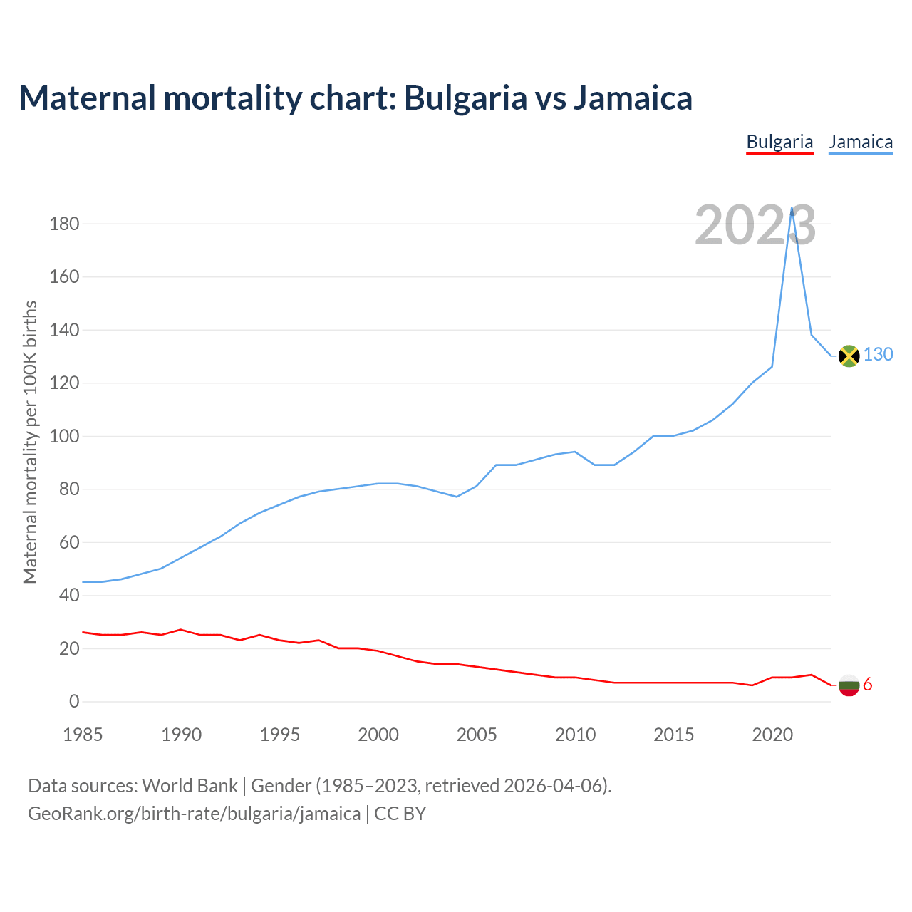 The maternal mortality rate, which is the probability of dying during childbirth or within 42 days of pregnancy termination, is 6 deaths per 100,000 live births in Bulgaria, compared to 130 deaths in Jamaica.