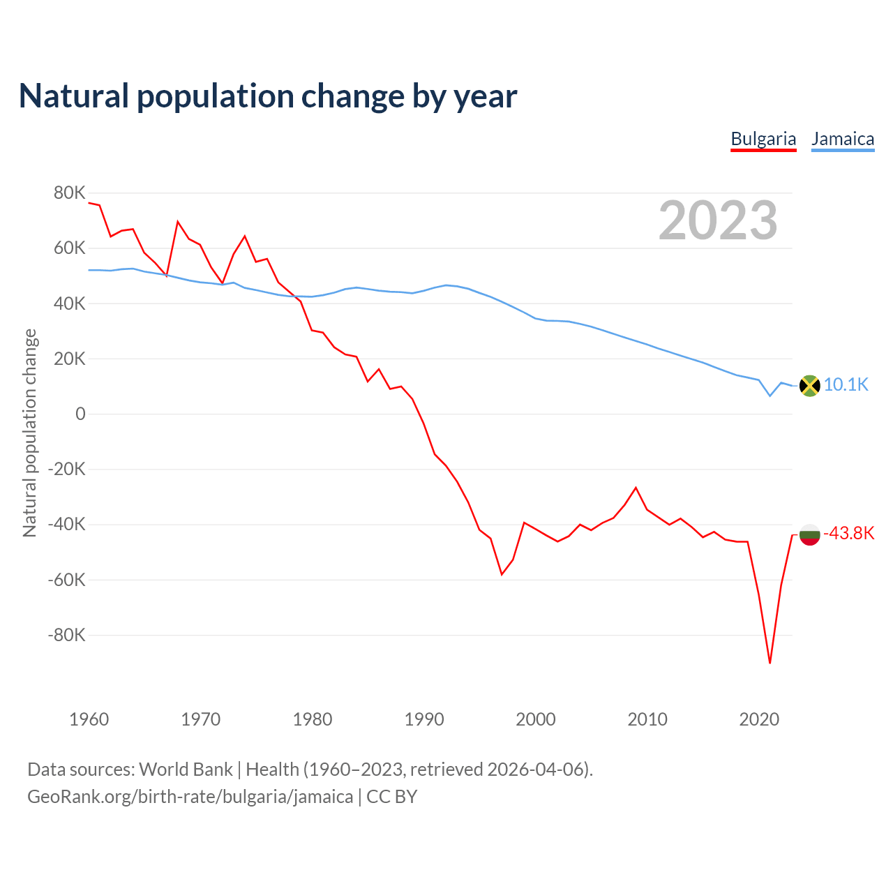 According to the latest available data on birth rates, the fertility rate in Bulgaria was 1.81 children per woman in 2023, compared to 1.36 in Jamaica in 2023. The replacement level is considered to be 2.1 children per woman.