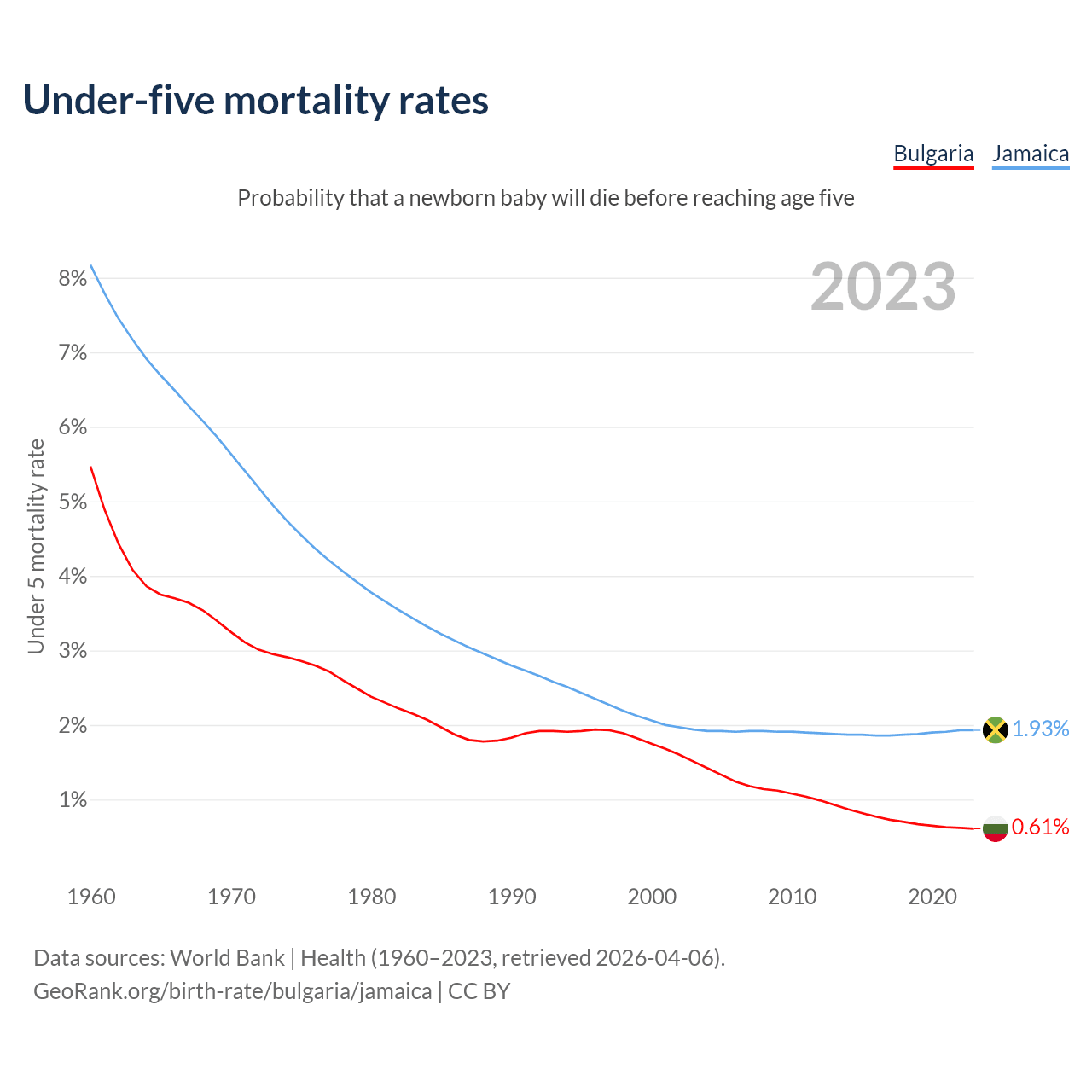 The chance that a newborn baby will die before reaching age five is 0.61% in Bulgaria and 1.93% in Jamaica. Above is a chart with historical data on under-five mortality rates.