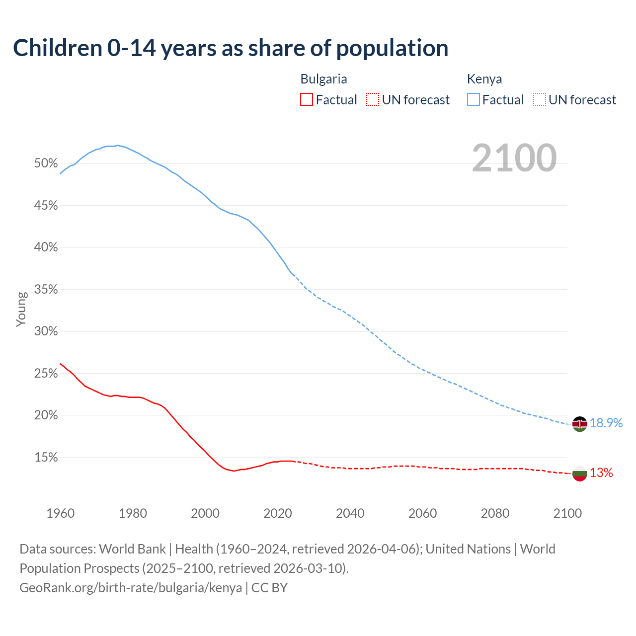 According to the latest available data on birth rates, the fertility rate in Bulgaria was 1.81 children per woman in 2023, compared to 3.21 in Kenya in 2023. The replacement level is considered to be 2.1 children per woman.