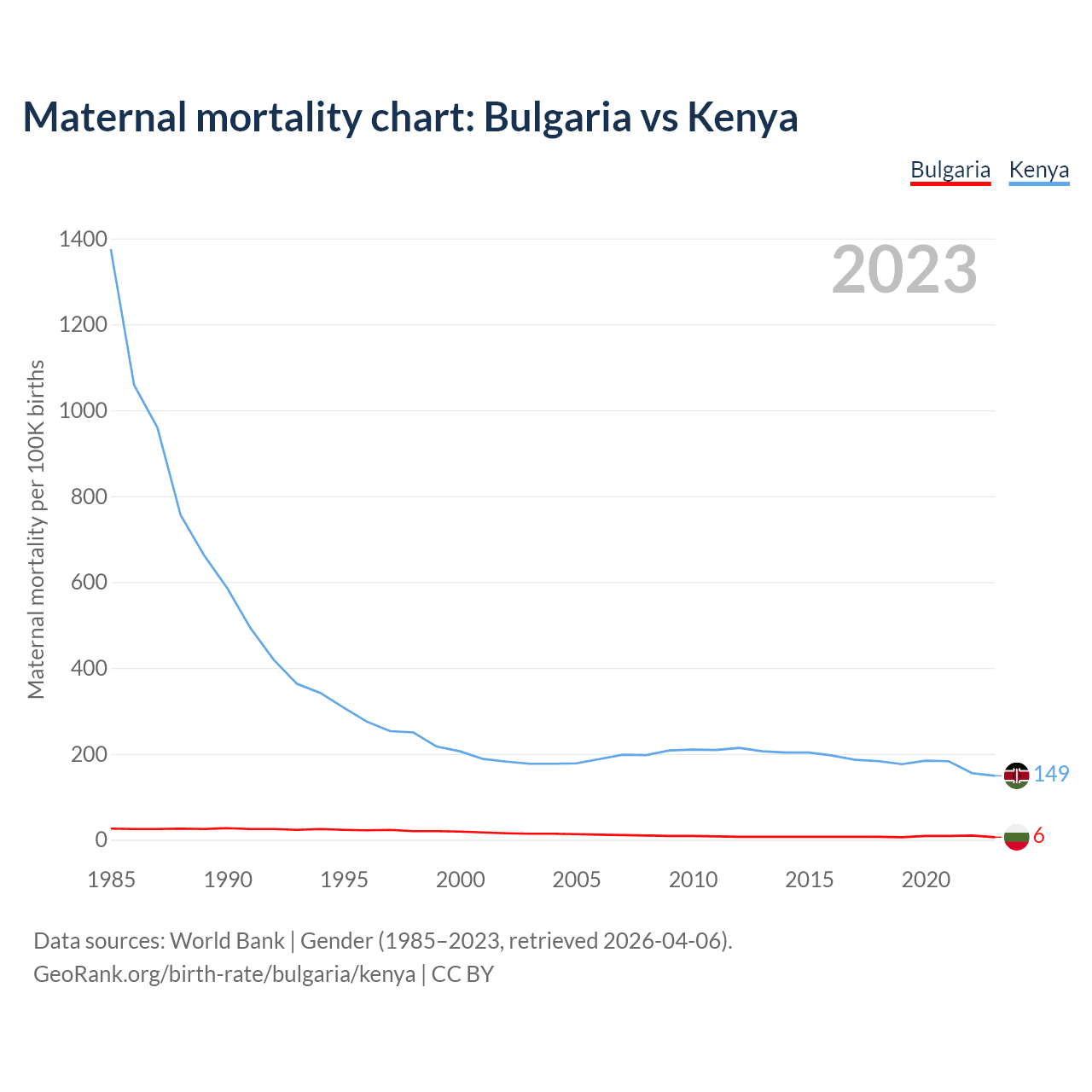 The maternal mortality rate, which is the probability of dying during childbirth or within 42 days of pregnancy termination, is 6 deaths per 100,000 live births in Bulgaria, compared to 149 deaths in Kenya.