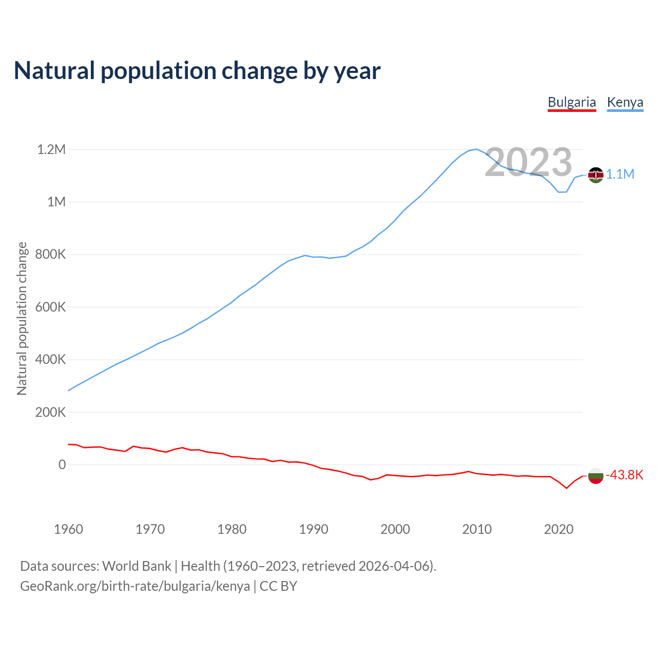 Bulgaria has an annual birth rate of 8.9 births per 1,000 people, compared to 27.1 for Kenya. The average number of children a woman is expected to have during her lifetime — the fertility rate, is 1.81 in Bulgaria and 3.21 in Kenya — 77.2% difference.