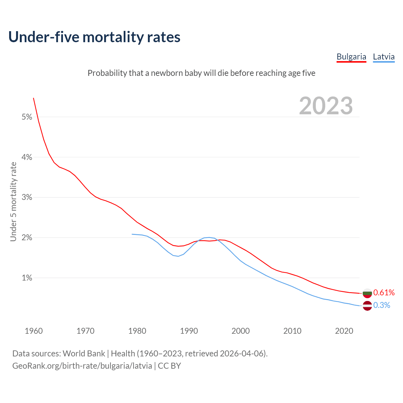 The chance that a newborn baby will die before reaching age five is 0.61% in Bulgaria and 0.3% in Latvia. Above is a chart with historical data on under-five mortality rates.