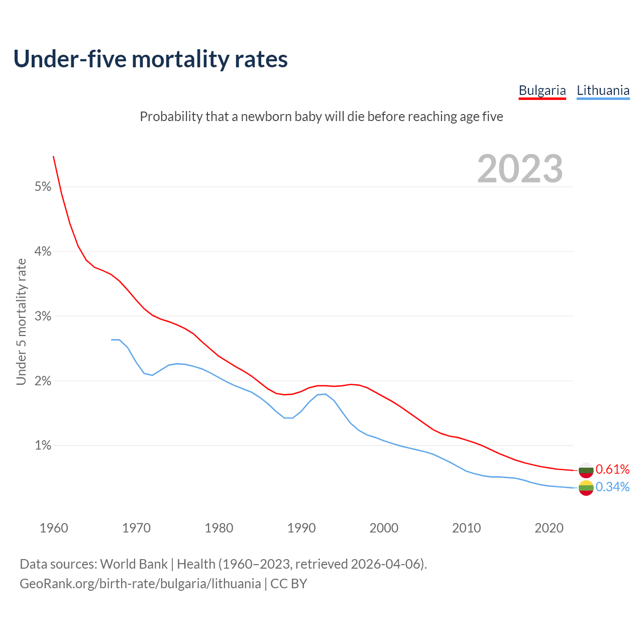 The chance that a newborn baby will die before reaching age five is 0.61% in Bulgaria and 0.34% in Lithuania. Above is a chart with historical data on under-five mortality rates.