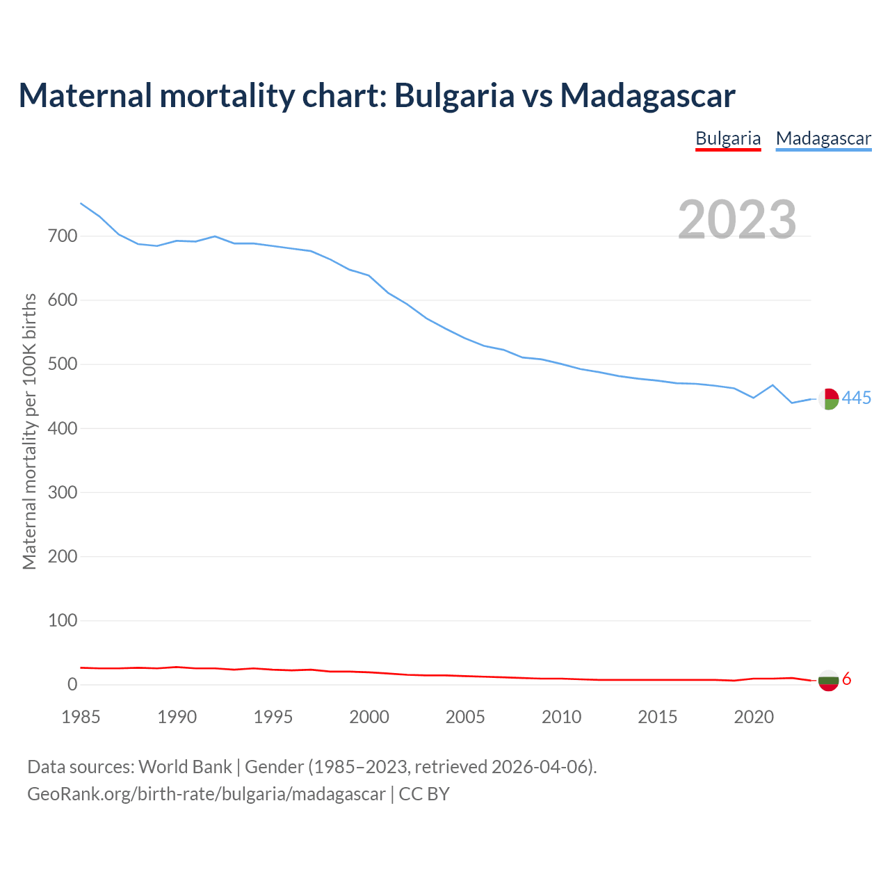 The maternal mortality rate, which is the probability of dying during childbirth or within 42 days of pregnancy termination, is 6 deaths per 100,000 live births in Bulgaria, compared to 445 deaths in Madagascar.