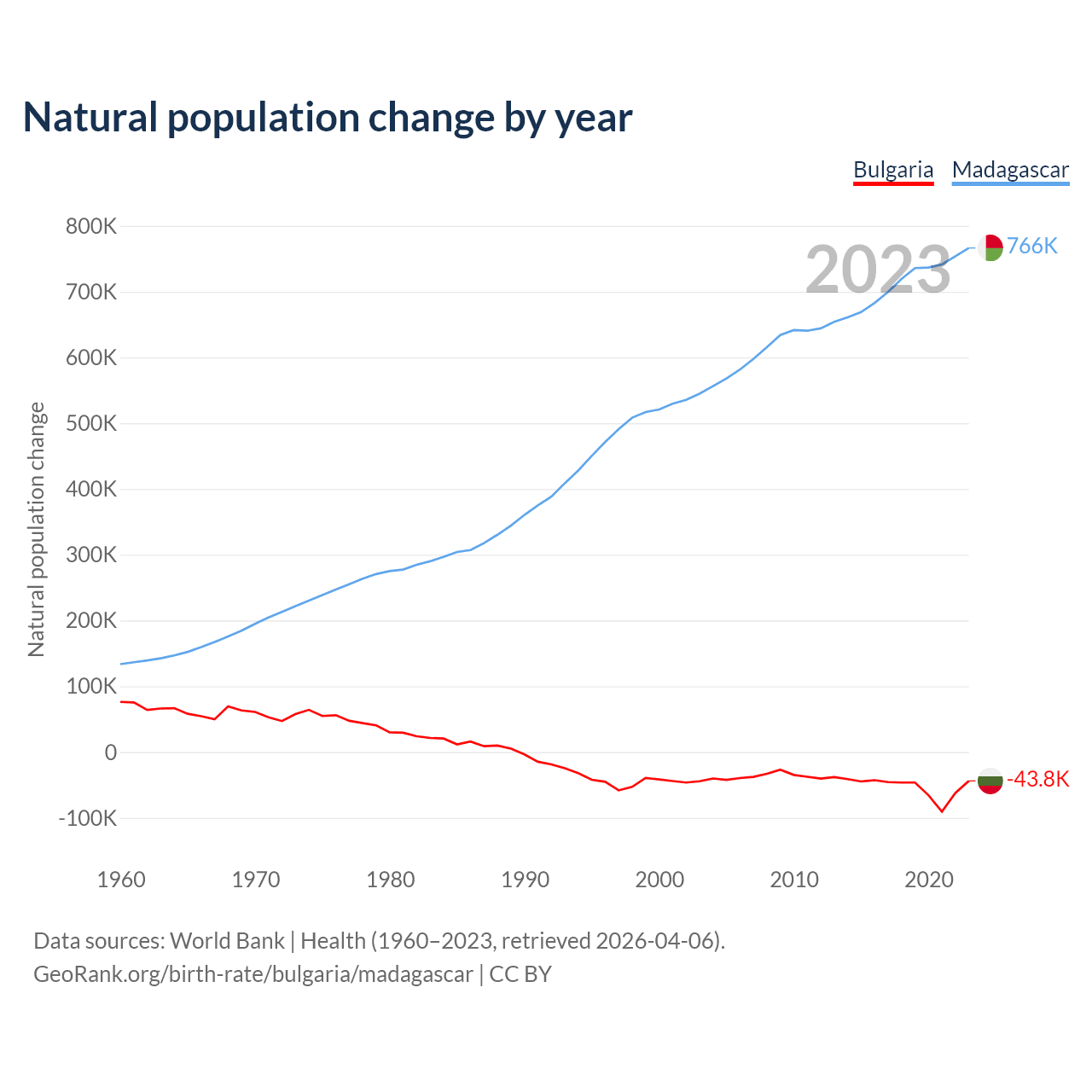 Bulgaria has an annual birth rate of 8.9 births per 1,000 people, compared to 32.1 for Madagascar. The average number of children a woman is expected to have during her lifetime — the fertility rate, is 1.81 in Bulgaria and 3.97 in Madagascar — 119.4% difference.
