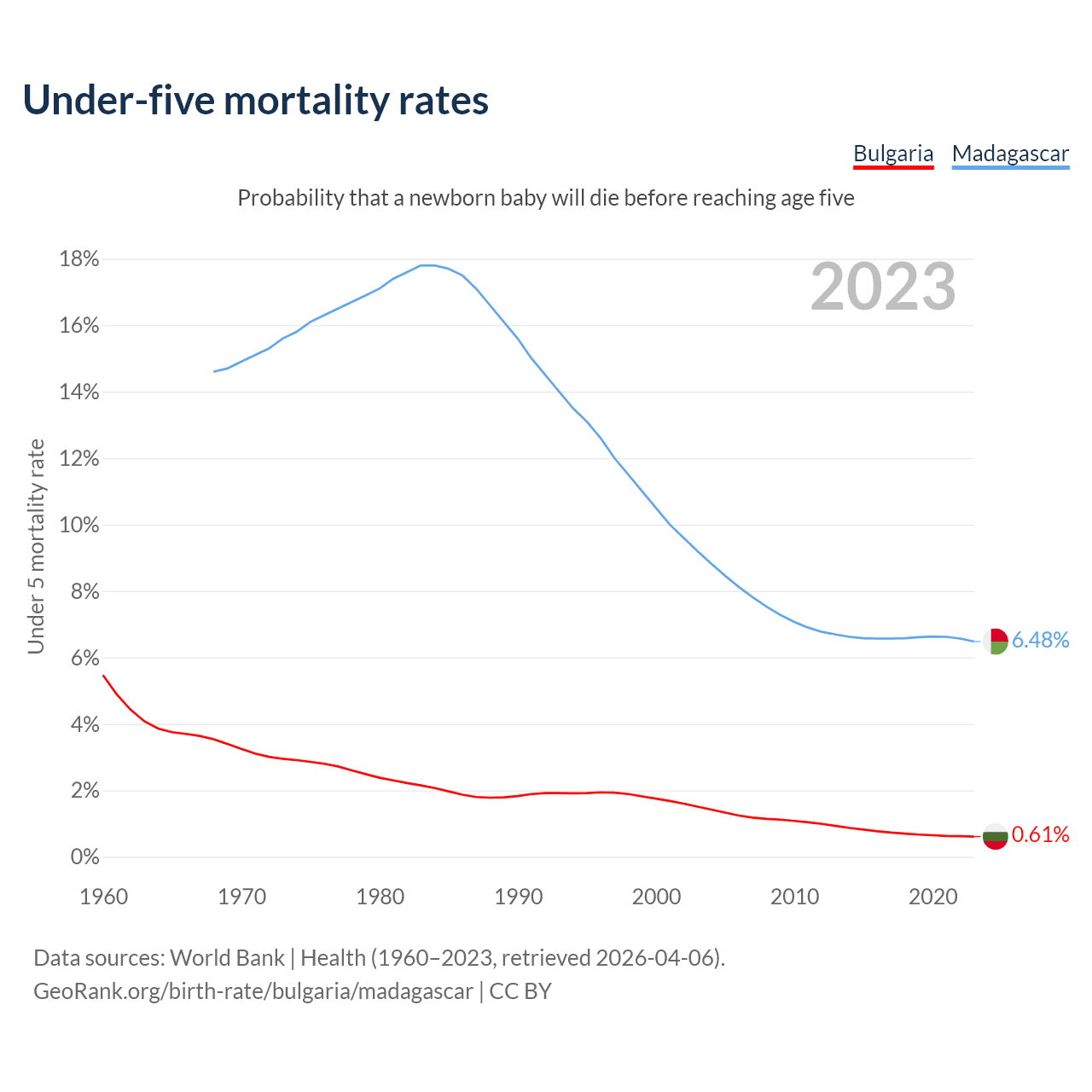 The chance that a newborn baby will die before reaching age five is 0.61% in Bulgaria and 6.48% in Madagascar. Above is a chart with historical data on under-five mortality rates.
