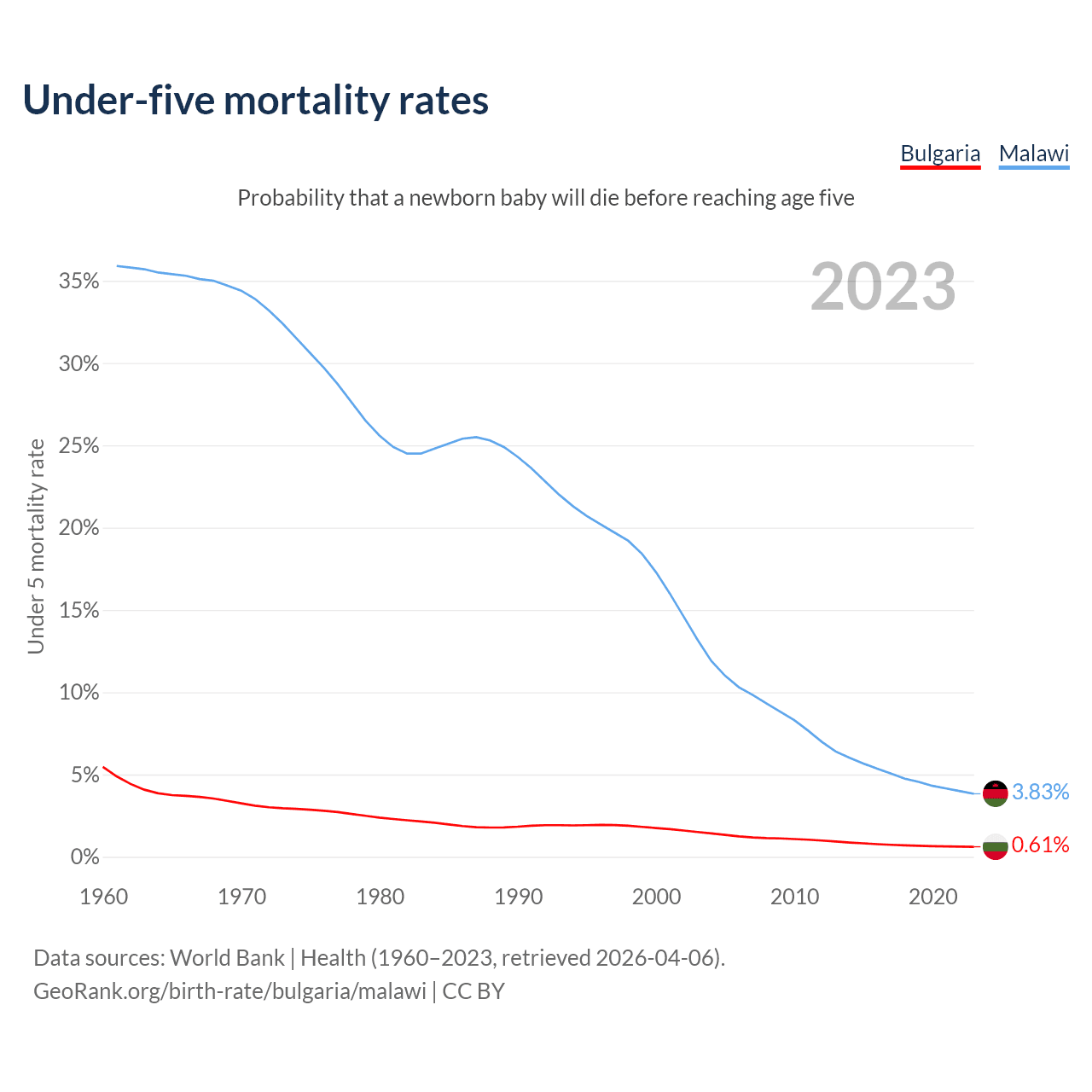 The chance that a newborn baby will die before reaching age five is 0.61% in Bulgaria and 3.83% in Malawi. Above is a chart with historical data on under-five mortality rates.