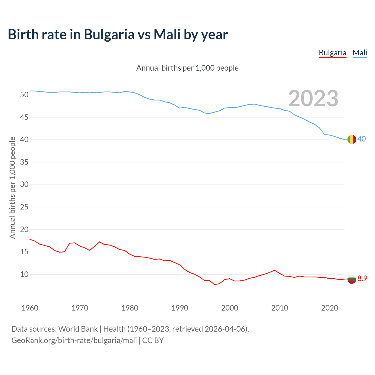 Bulgaria has an annual birth rate of 8.9 births per 1,000 people, compared to 40 for Mali. The average number of children a woman is expected to have during her lifetime — the fertility rate, is 1.81 in Bulgaria and 5.61 in Mali — 210.2% difference.