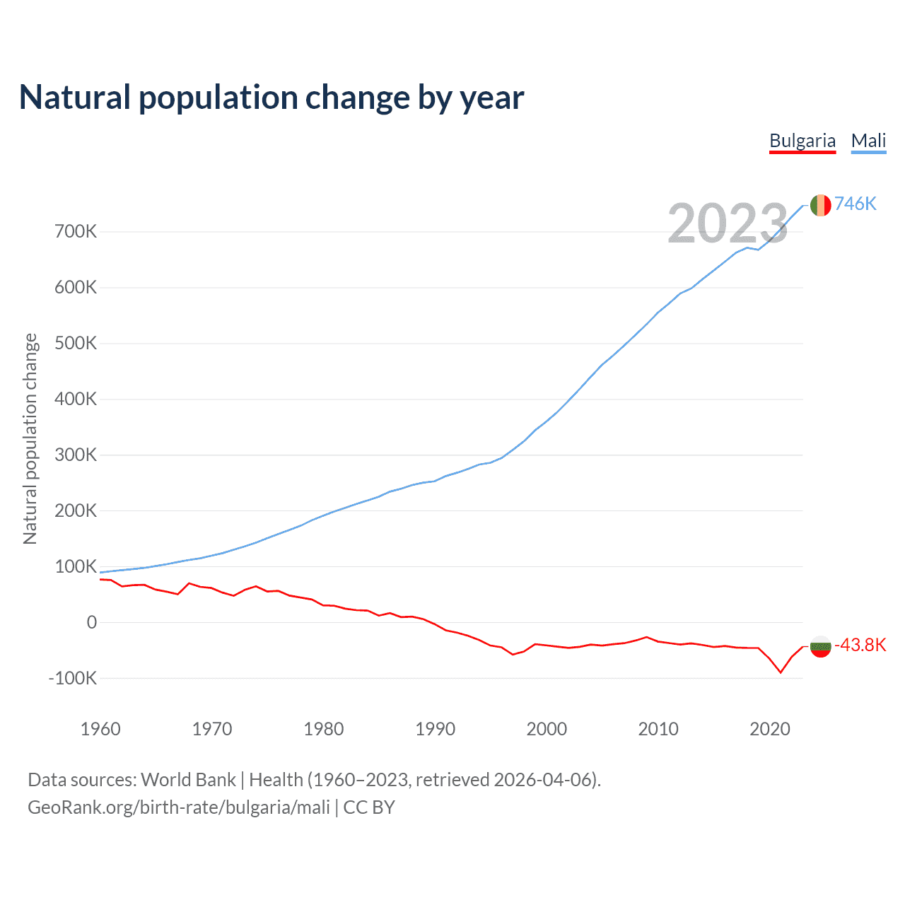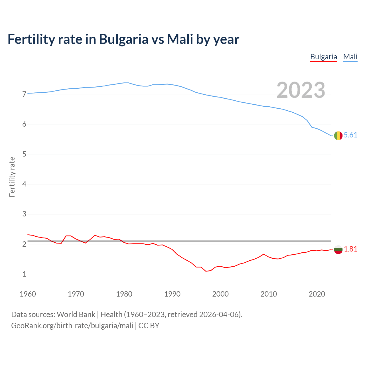 According to the latest available data on birth rates, the fertility rate in Bulgaria was 1.81 children per woman in 2023, compared to 5.61 in Mali in 2023. The replacement level is considered to be 2.1 children per woman.