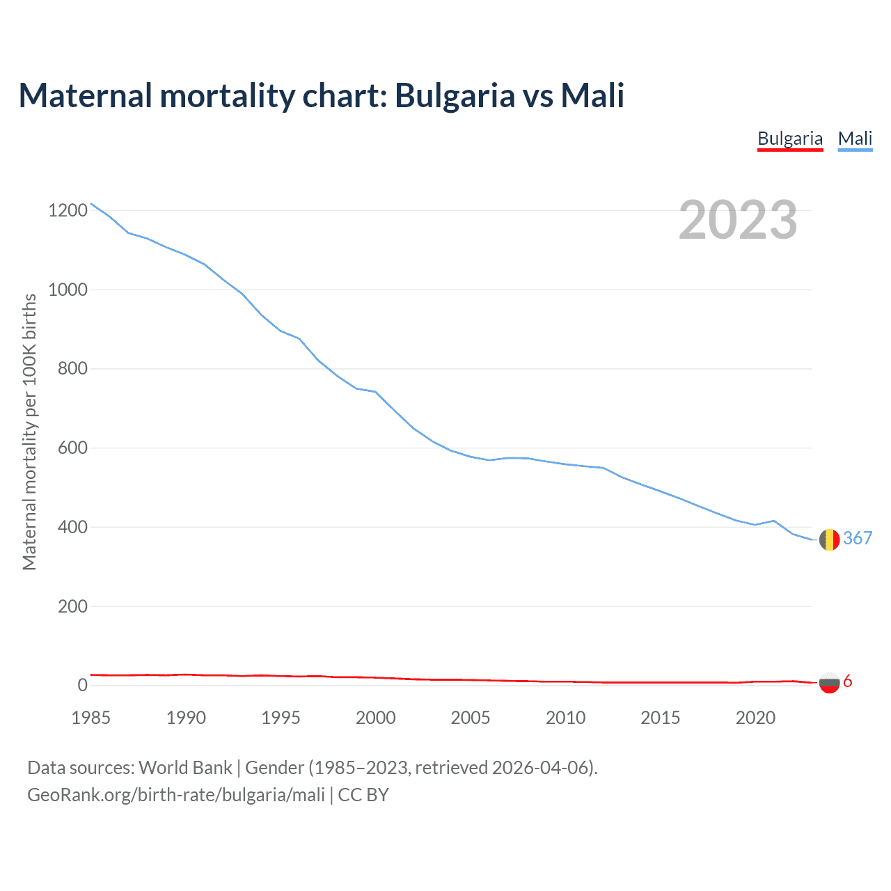 The maternal mortality rate, which is the probability of dying during childbirth or within 42 days of pregnancy termination, is 6 deaths per 100,000 live births in Bulgaria, compared to 367 deaths in Mali.