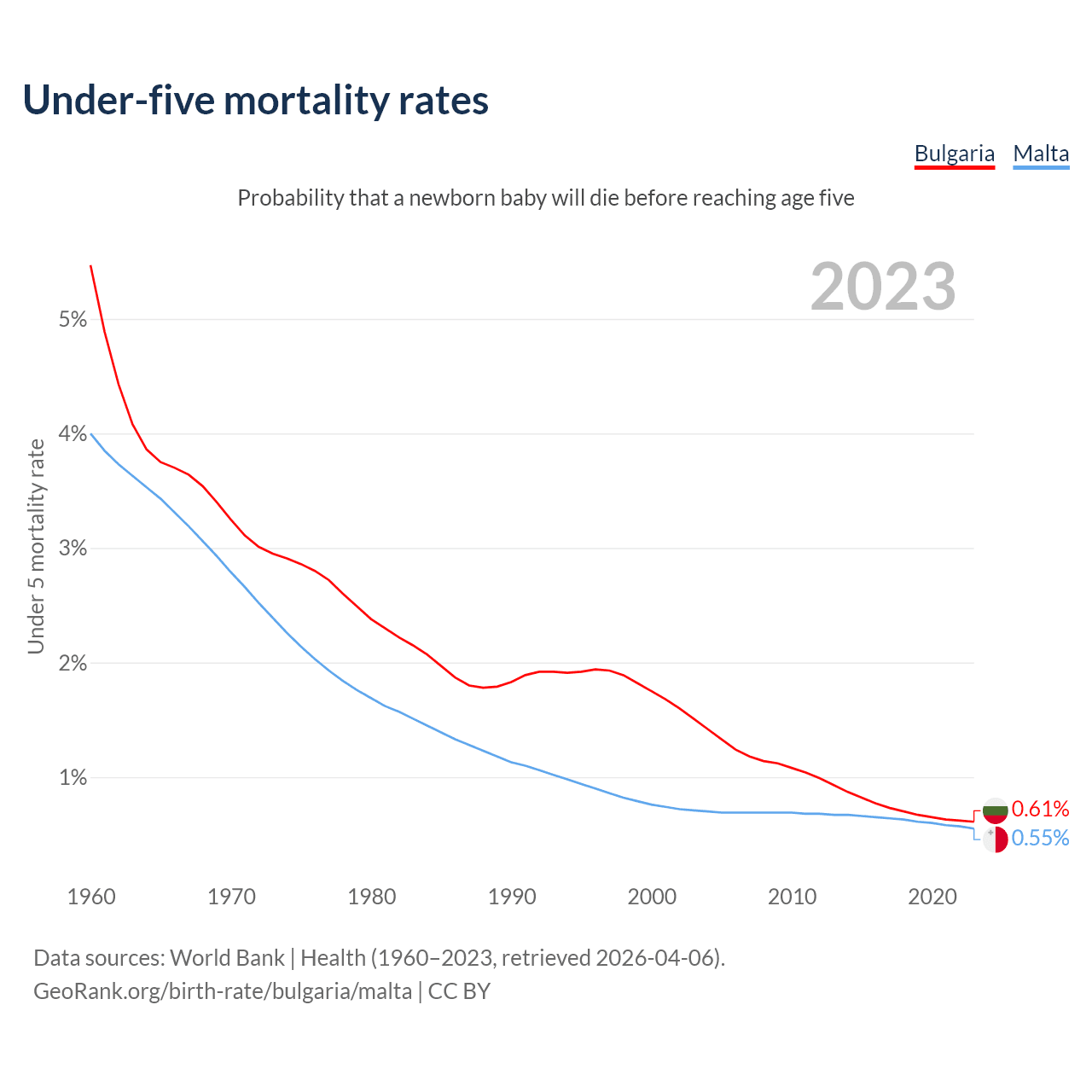 The chance that a newborn baby will die before reaching age five is 0.61% in Bulgaria and 0.55% in Malta. Above is a chart with historical data on under-five mortality rates.